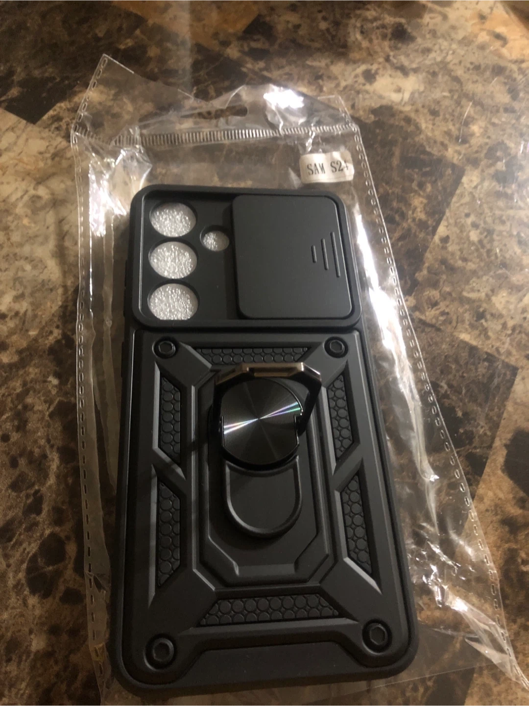 Selling a brand new black phone case for a Samsung S24. It's still in its original packaging and has a cool design with a ring stand and camera cover! Never used and ready for a new phone.