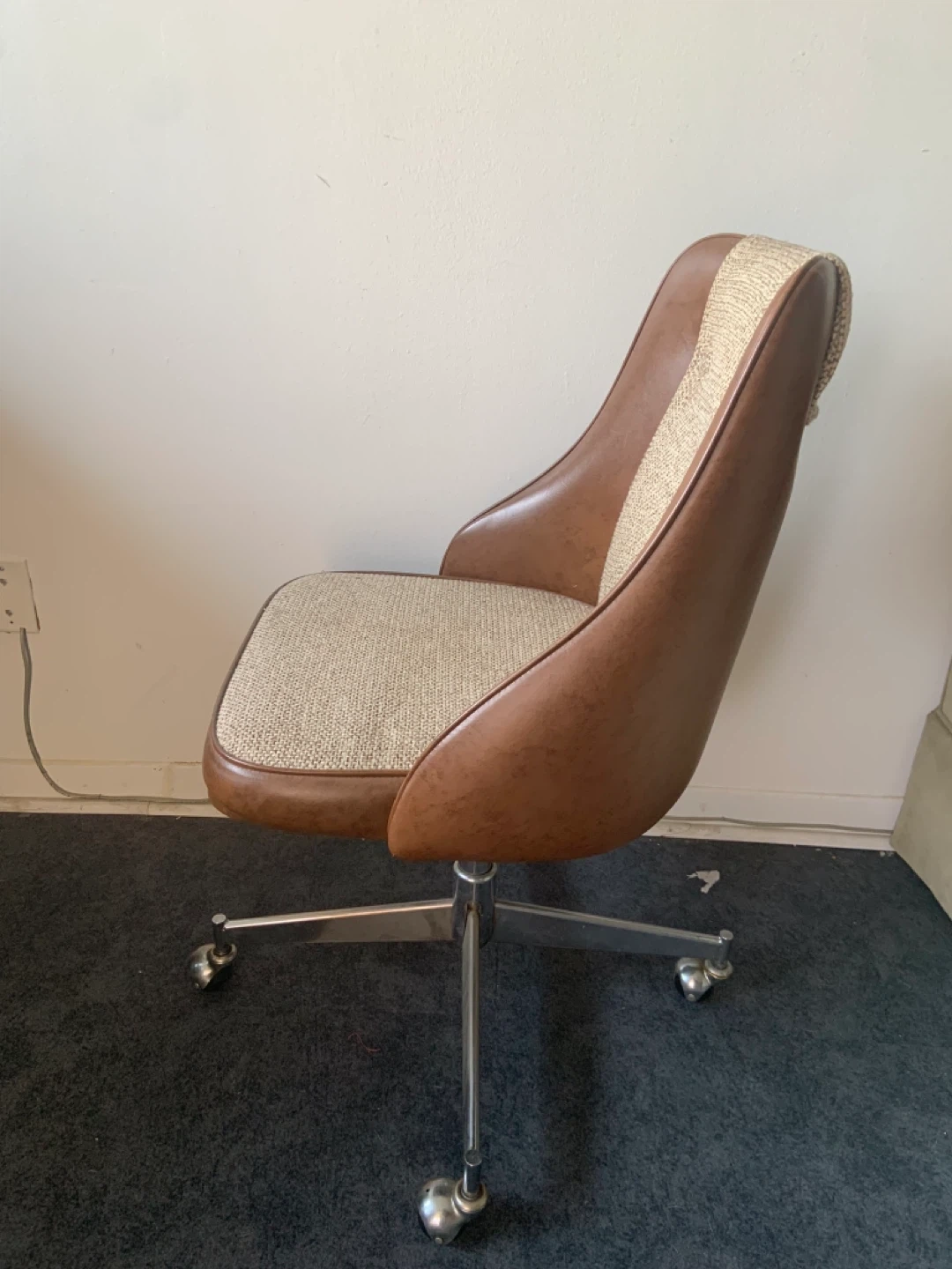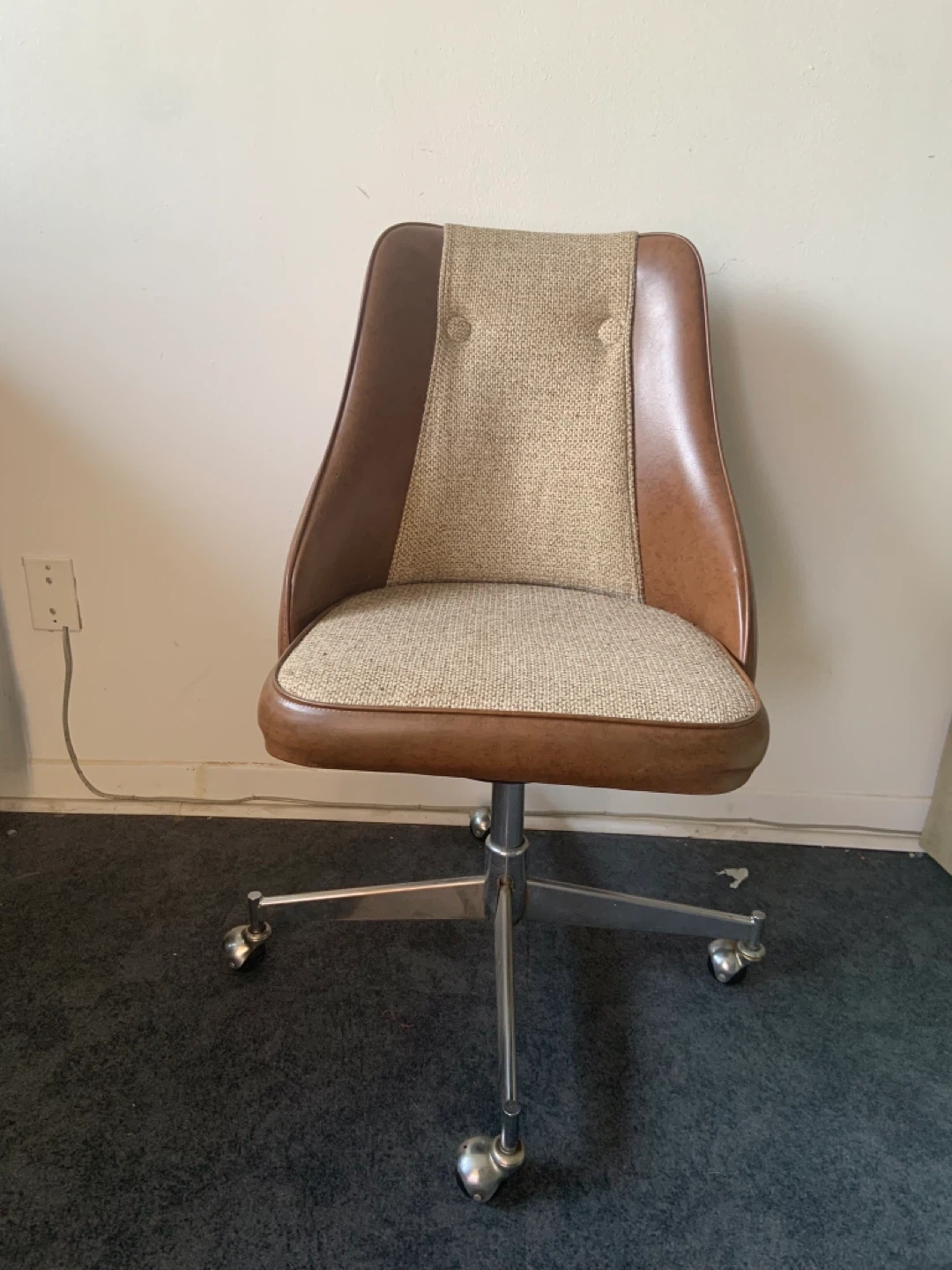 Offers two-tone brown and beige upholstery with a tufted backrest. Features a chrome five-star base with casters.