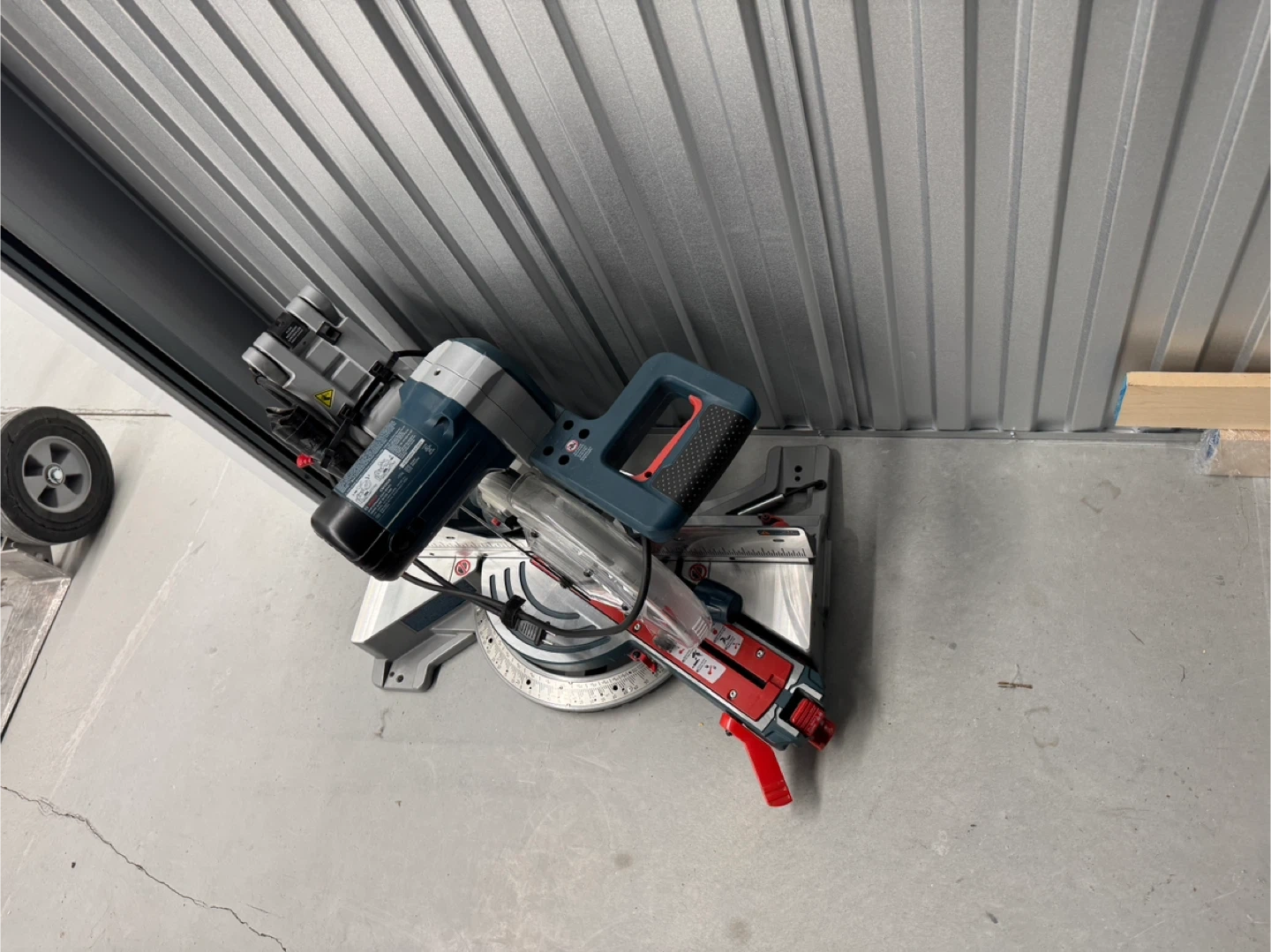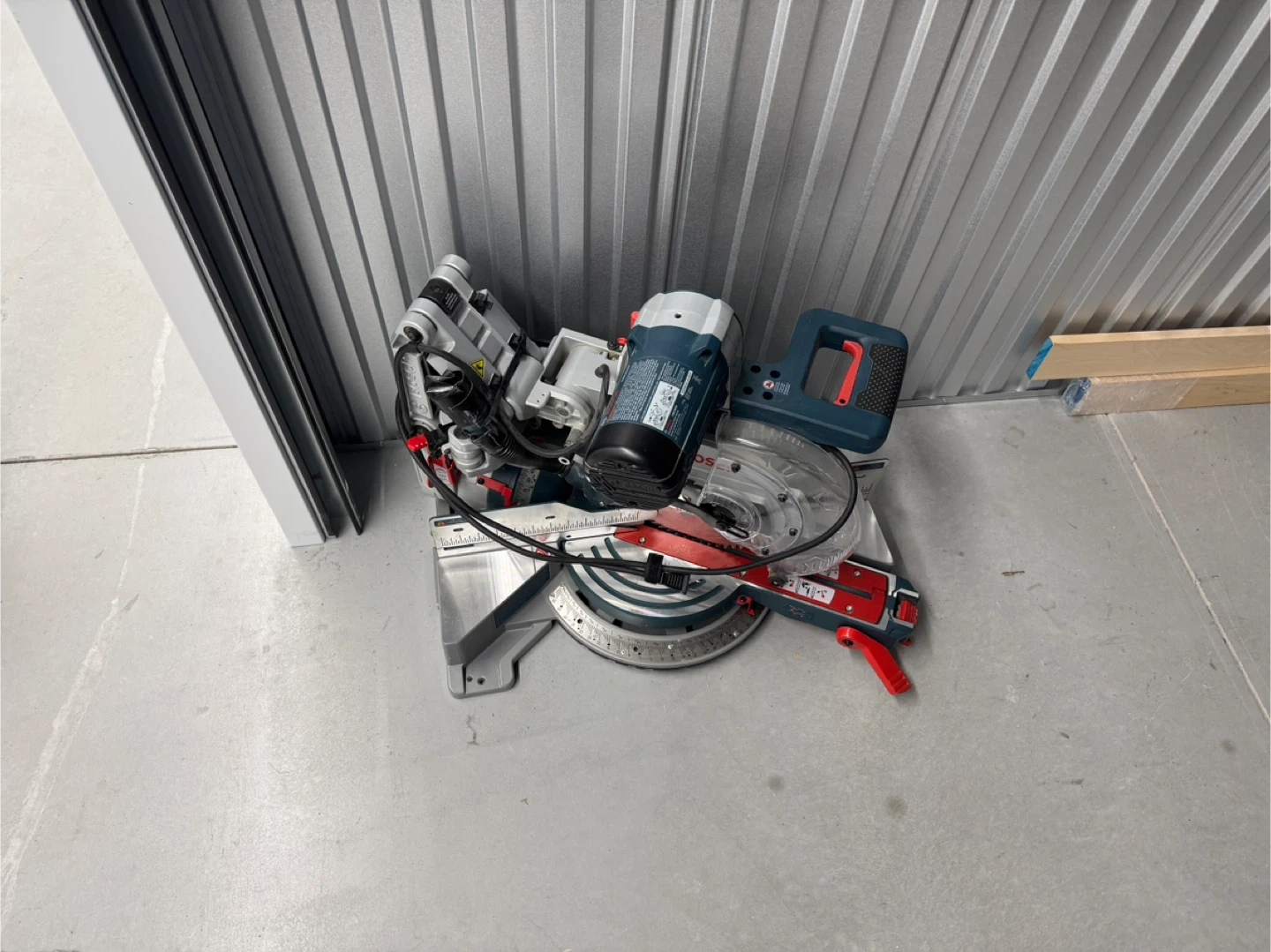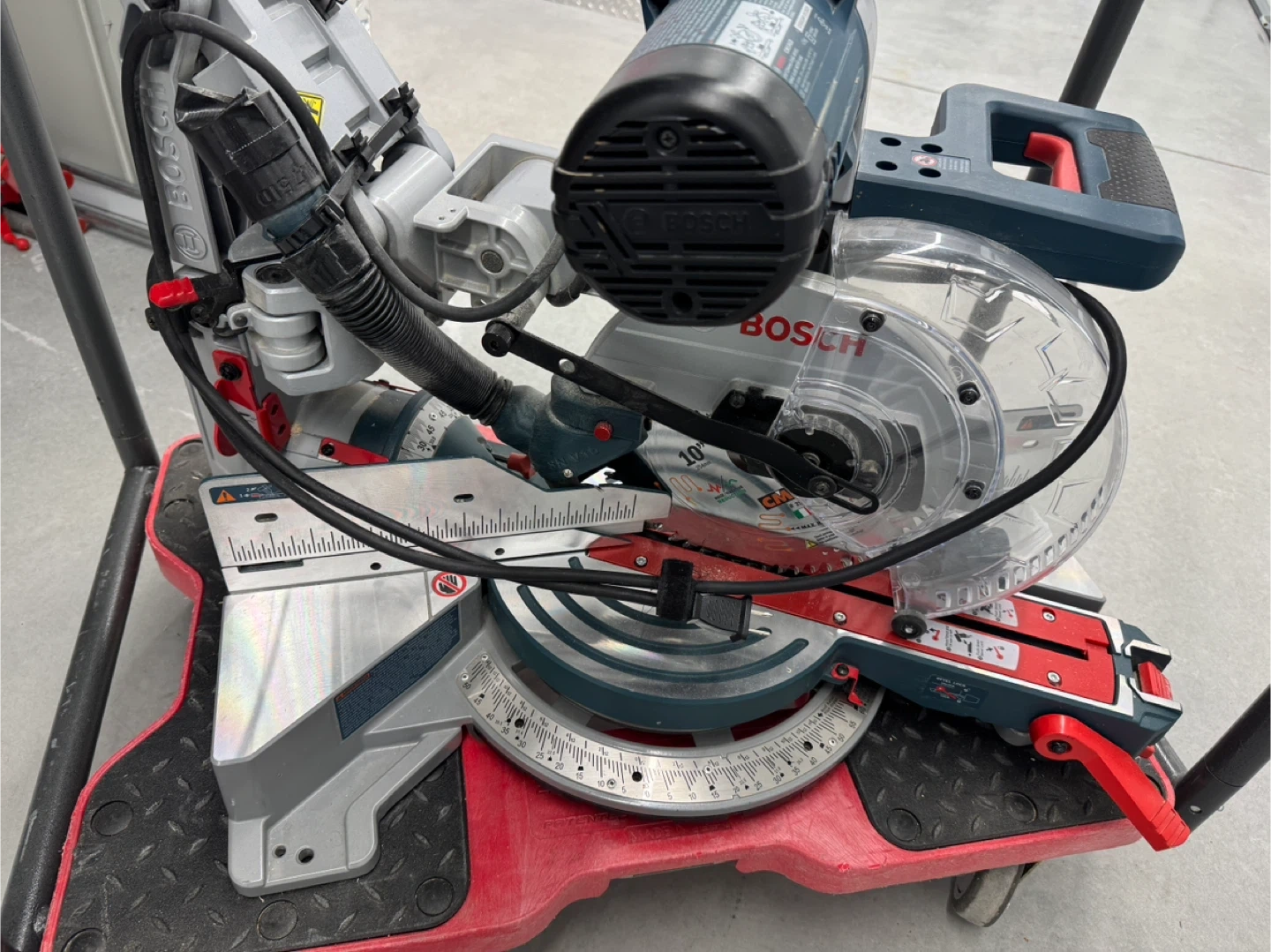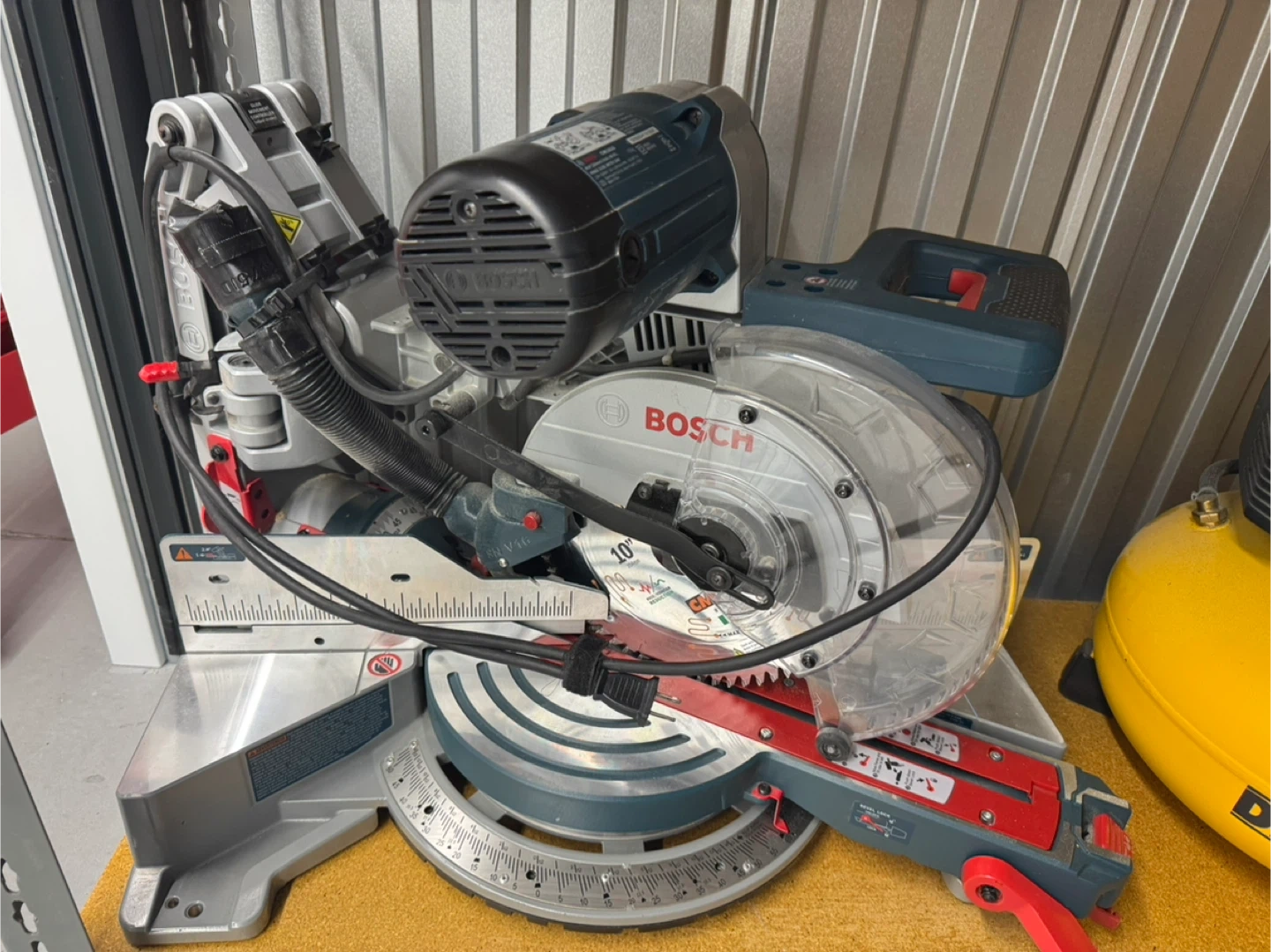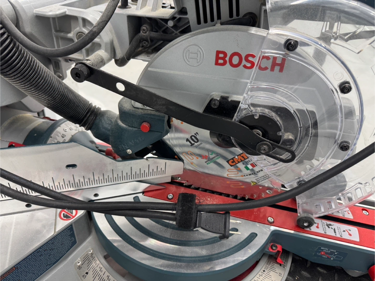 Bosch 10-inch miter saw. It's a powerful tool for making precise cuts. Includes blade guard and power cord.