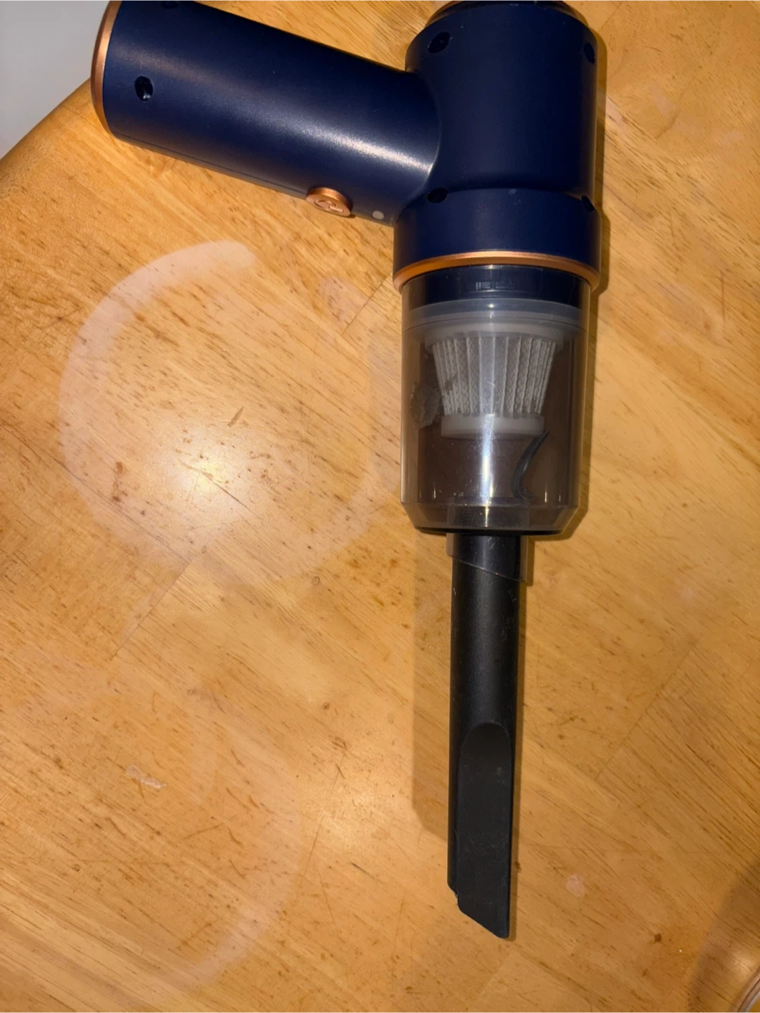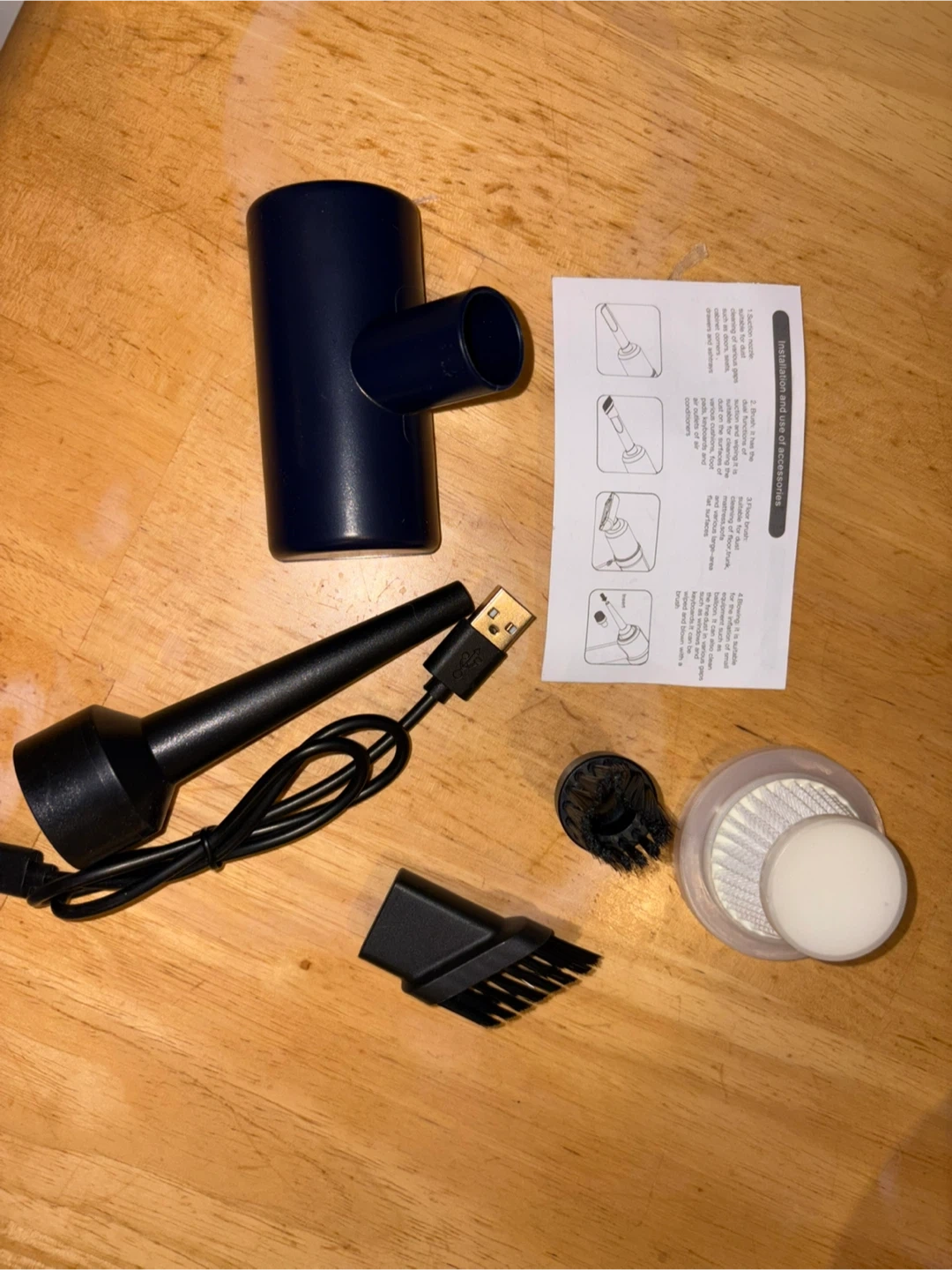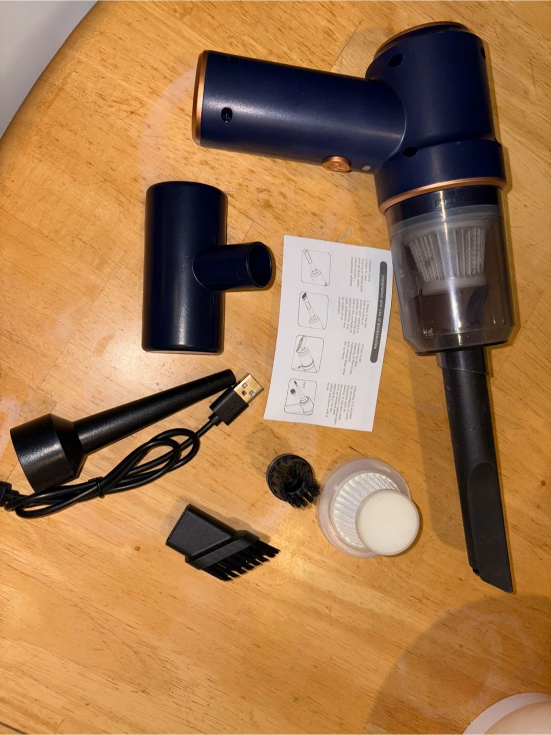 This is a portable handheld mini vacuum cleaner. It comes with a USB charging cable and multiple attachments for different cleaning needs. Its compact size makes it convenient for quick cleanups.