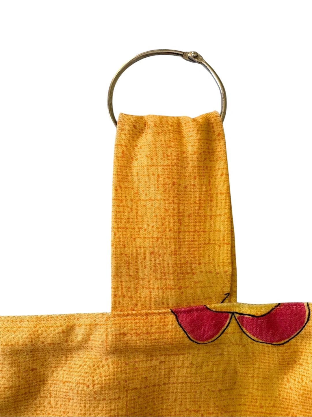 Yellow fabric panel with a floral pattern. It's a single curtain with tabs at the top for hanging. Fabric material. 66” long by 51” wide. There’s some wear at the bottom as shown.