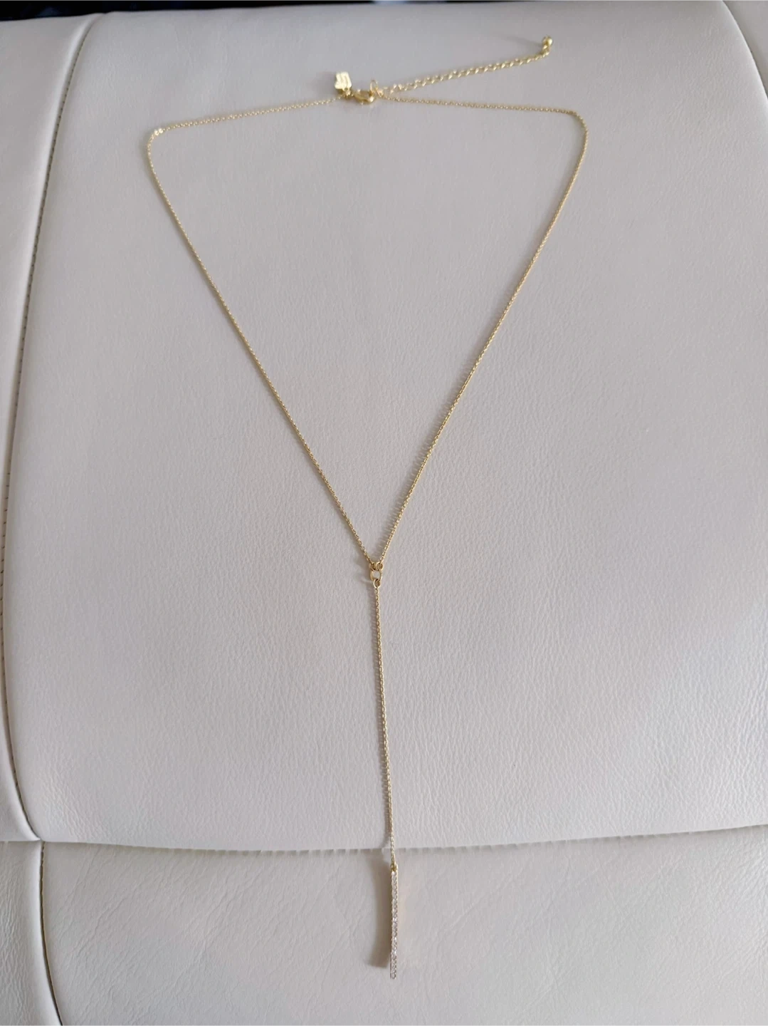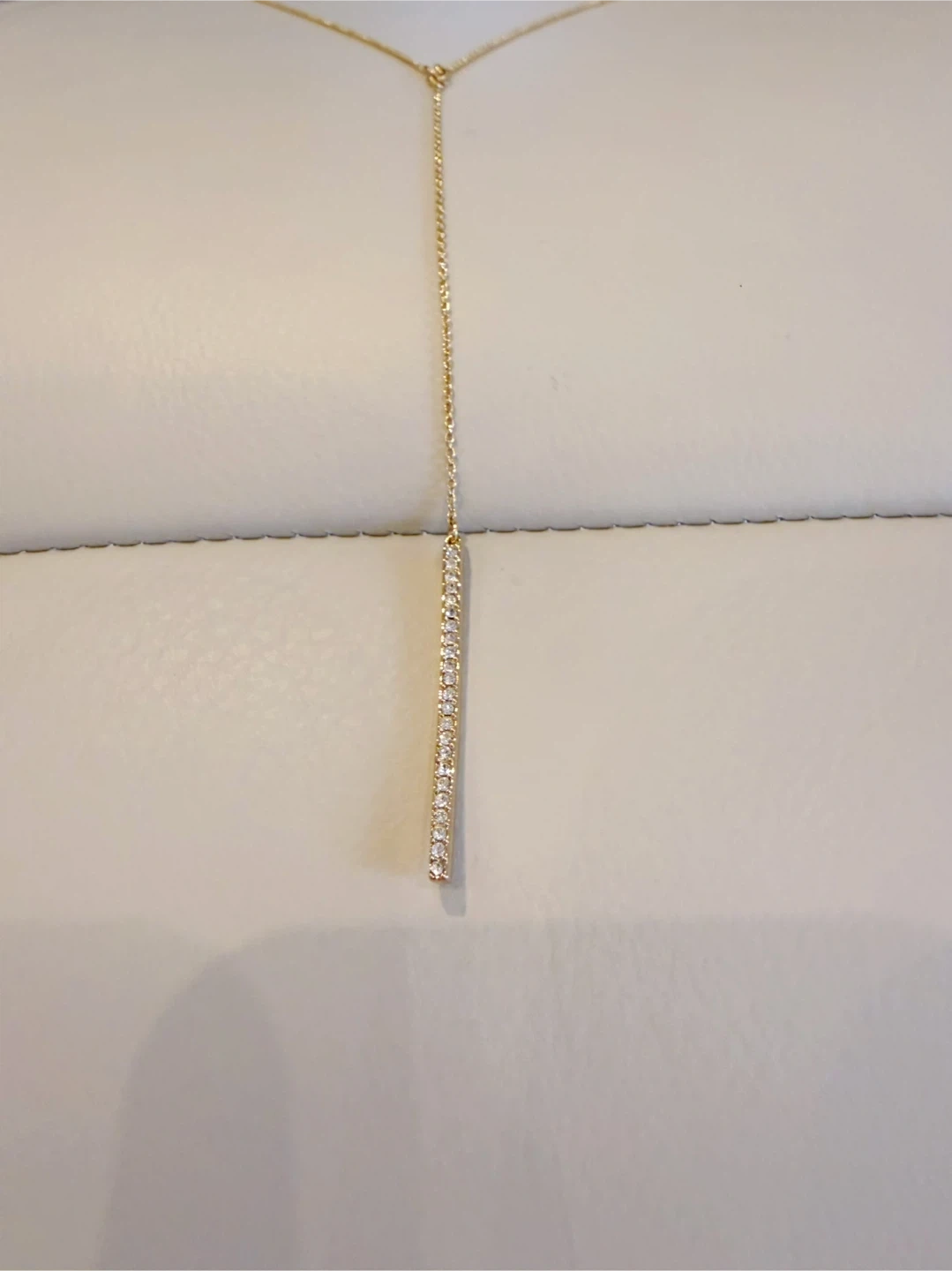 This necklace features a delicate gold tone chain. A linear pendant, encrusted with sparkling rhinestones, hangs at the end. It has an adjustable clasp for a comfortable fit.