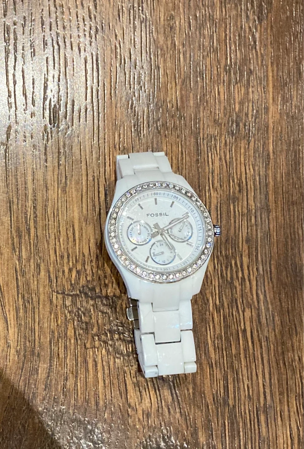 This is a white Fossil ceramic watch. It features a crystal-embellished bezel and a multi-dial display. The band is also white ceramic.