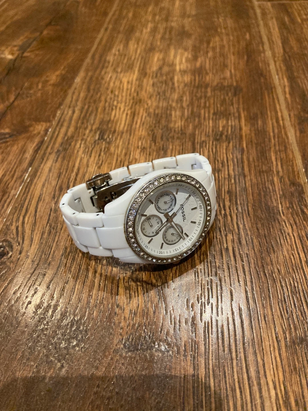 This is a white Fossil ceramic watch. It features a crystal-embellished bezel and a multi-dial display. The band is also white ceramic.