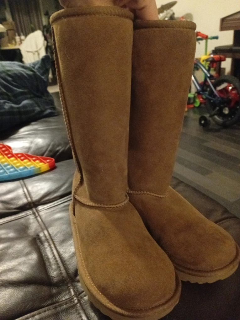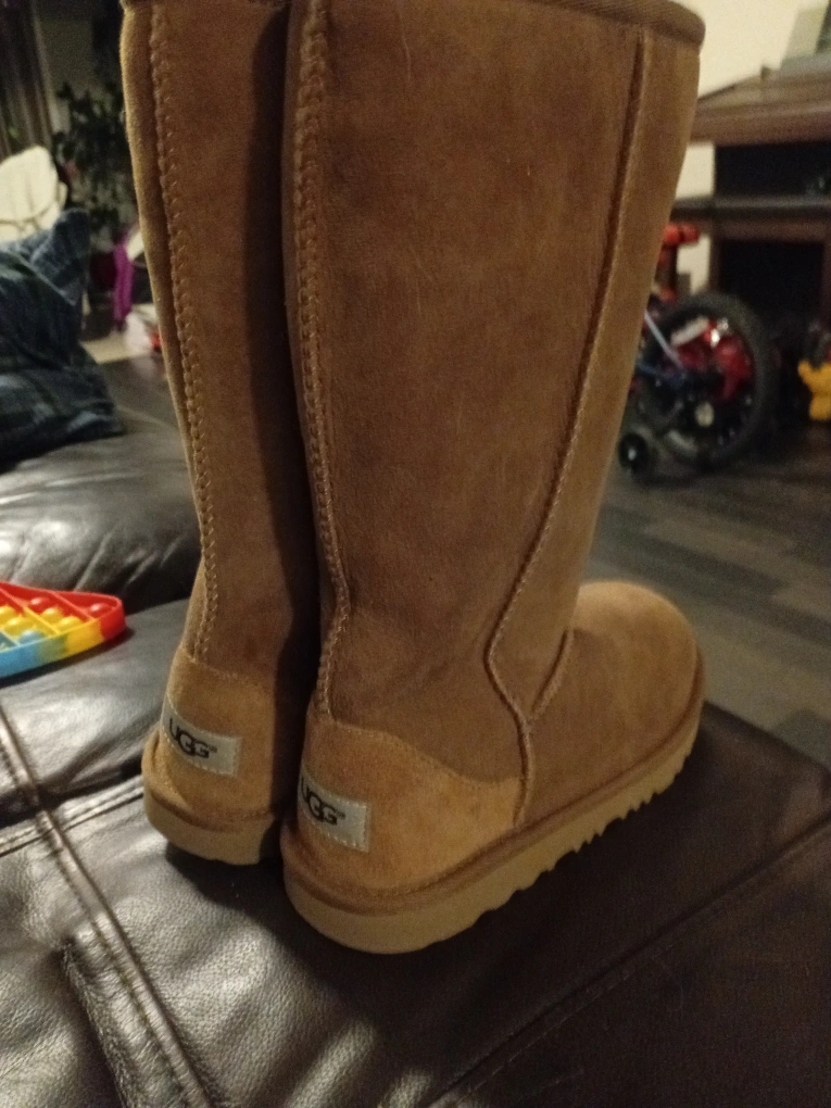 10Selling a pair of UGG tall boots in a lovely brown colour! They are a size 7. The sock lining is made of 100% wool, and the sock lining backing is 100% polyester. These boots are perfect for keeping your feet warm and cozy during the colder months!