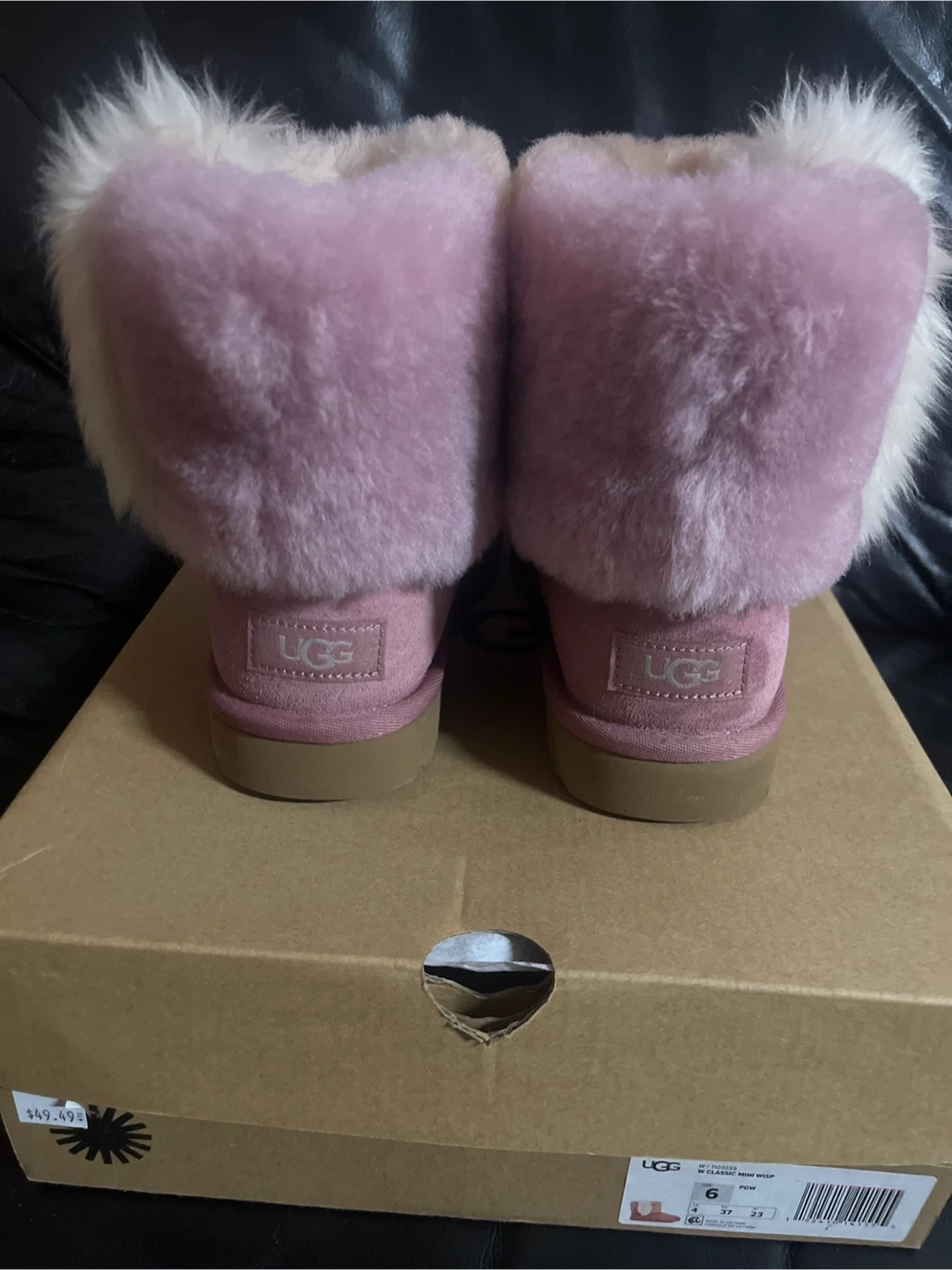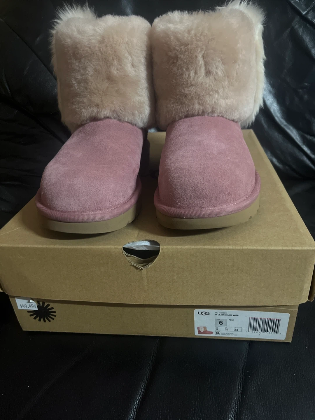 74Selling a pair of UGG Classic boots in a lovely pink colour! They are a size 6 and come with the original box. These boots are super comfy and stylish for the colder months!