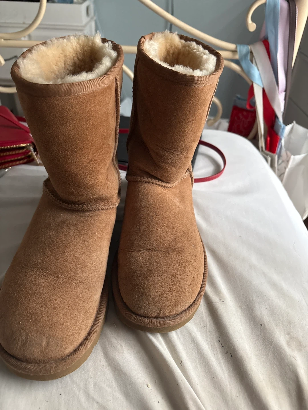 Cozy Ugg Classic Short boots in a lovely tan colour! Perfect for keeping your feet warm and stylish during the colder months. They're in great condition and ready for a new home. Size 7.
