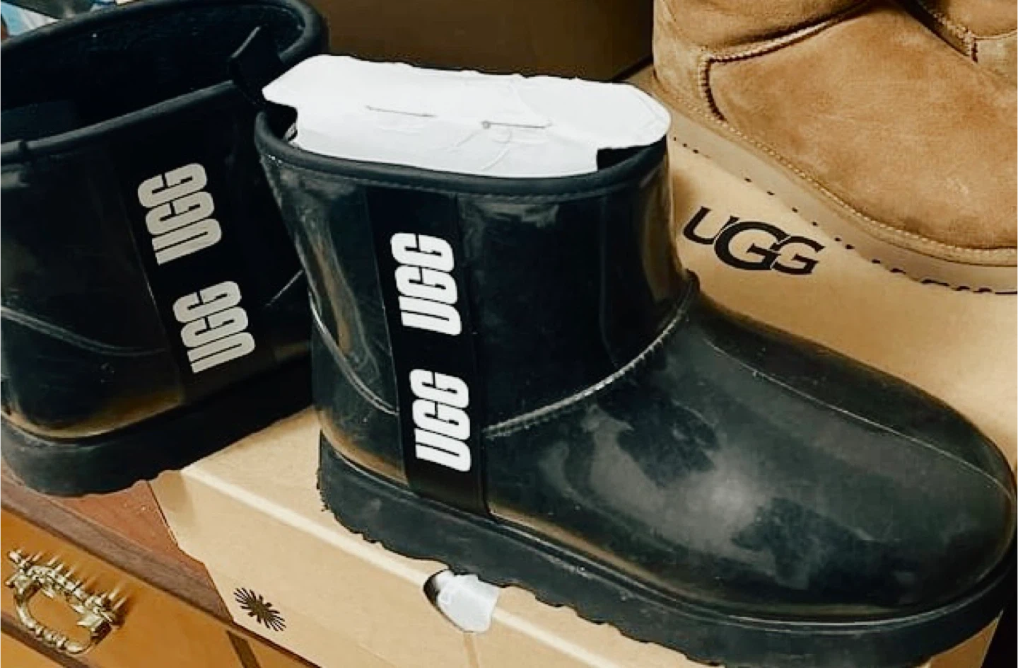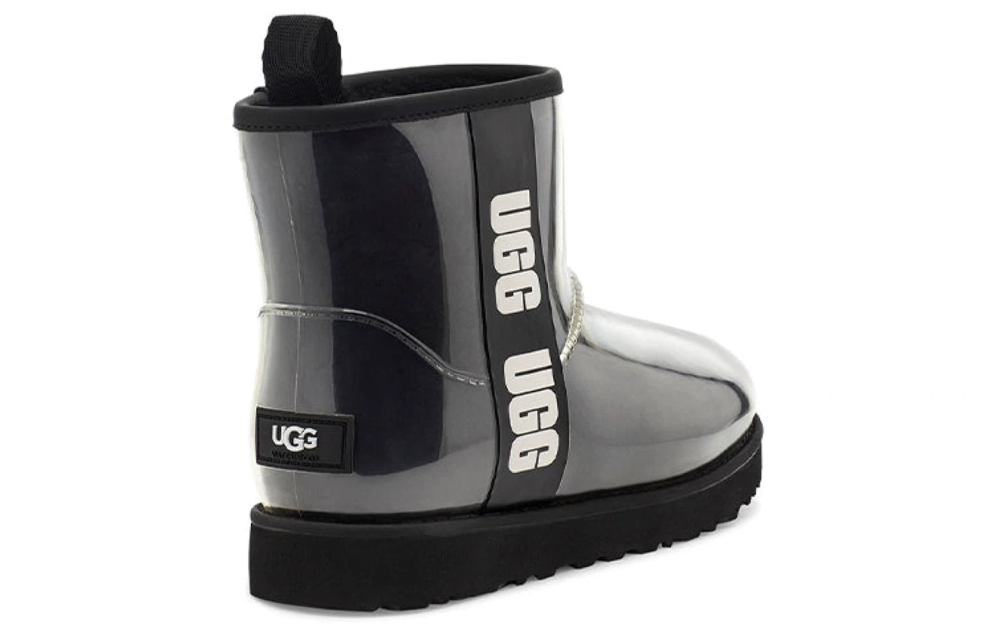 These UGG clear boots are super stylish and in great condition! They're a size 10 and would be perfect for rainy days or adding a unique touch to your outfit. The UGG logo is prominently displayed on the side. They feature a cozy inner lining