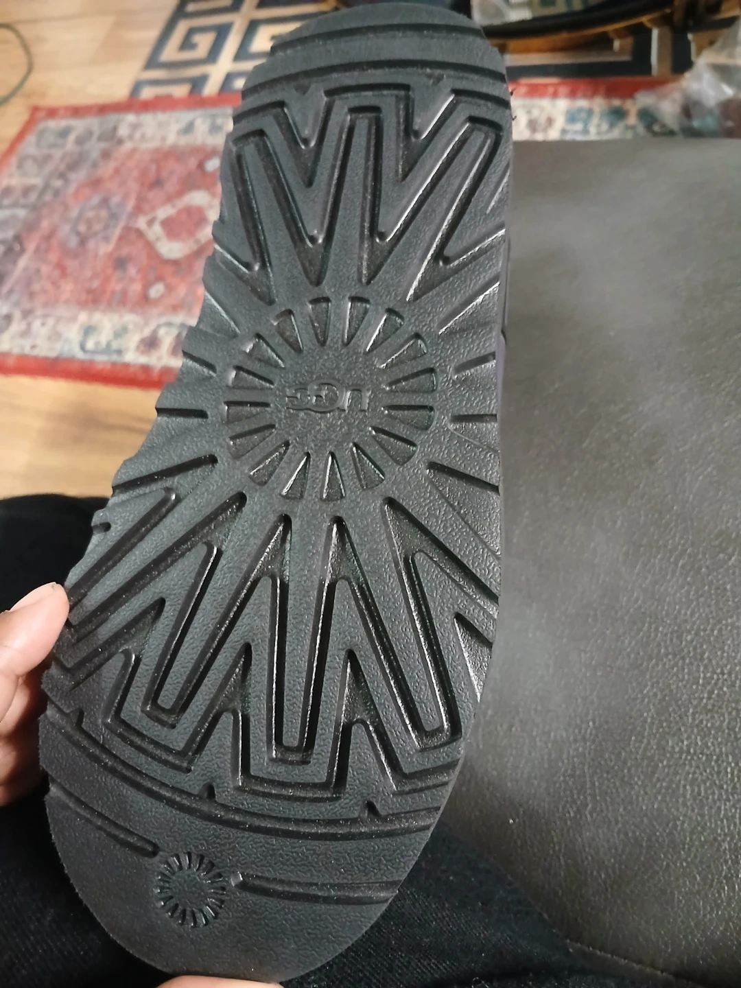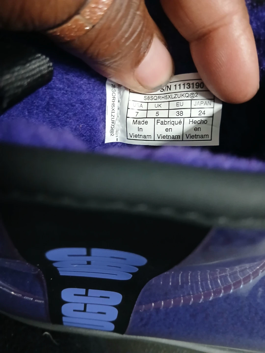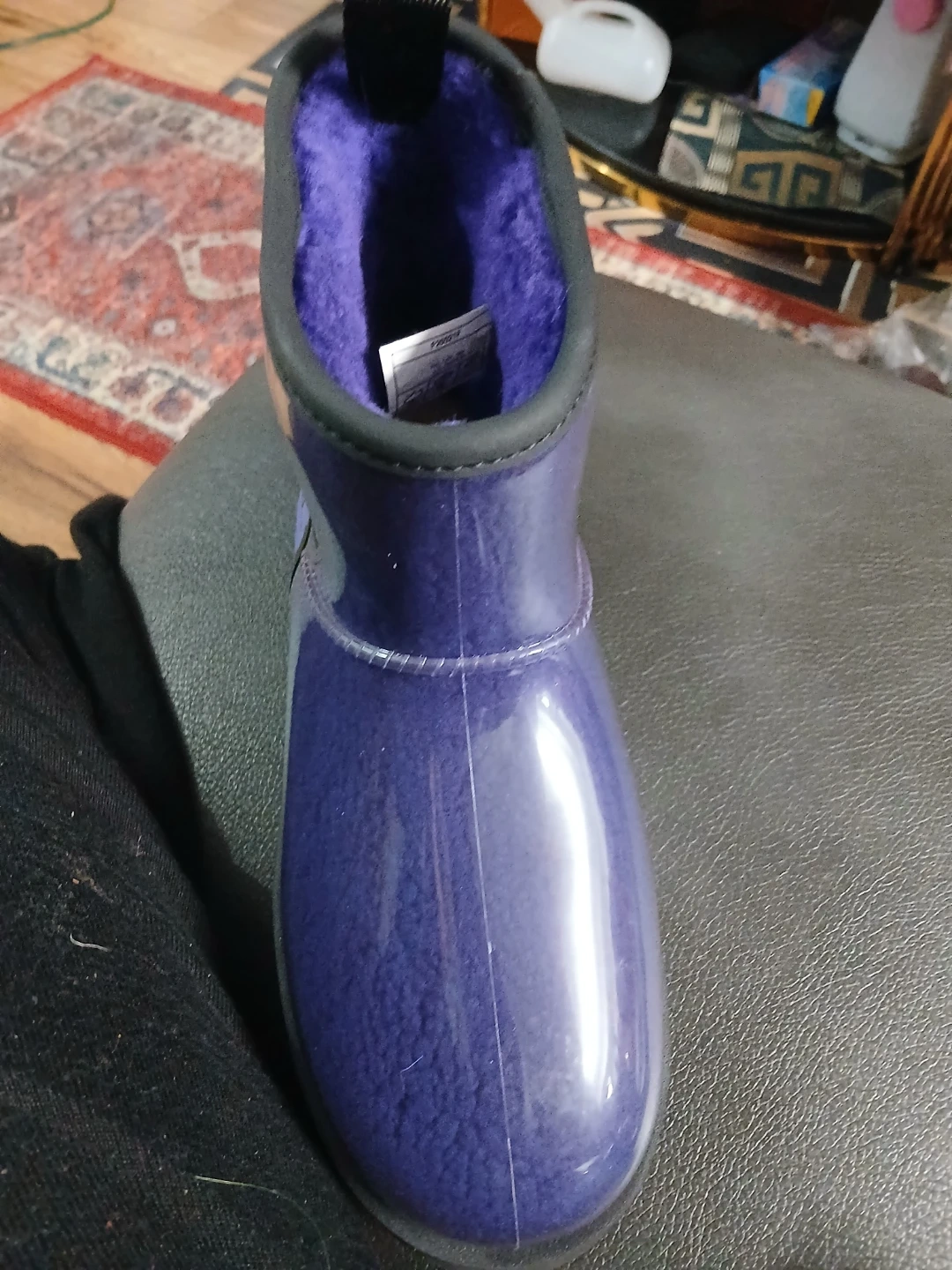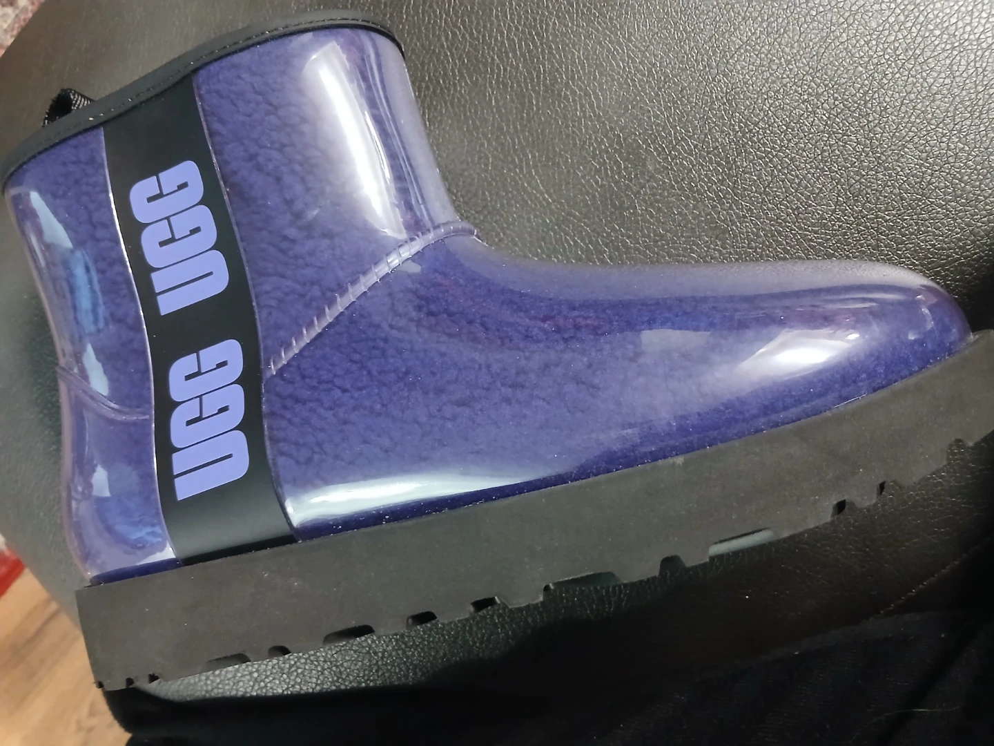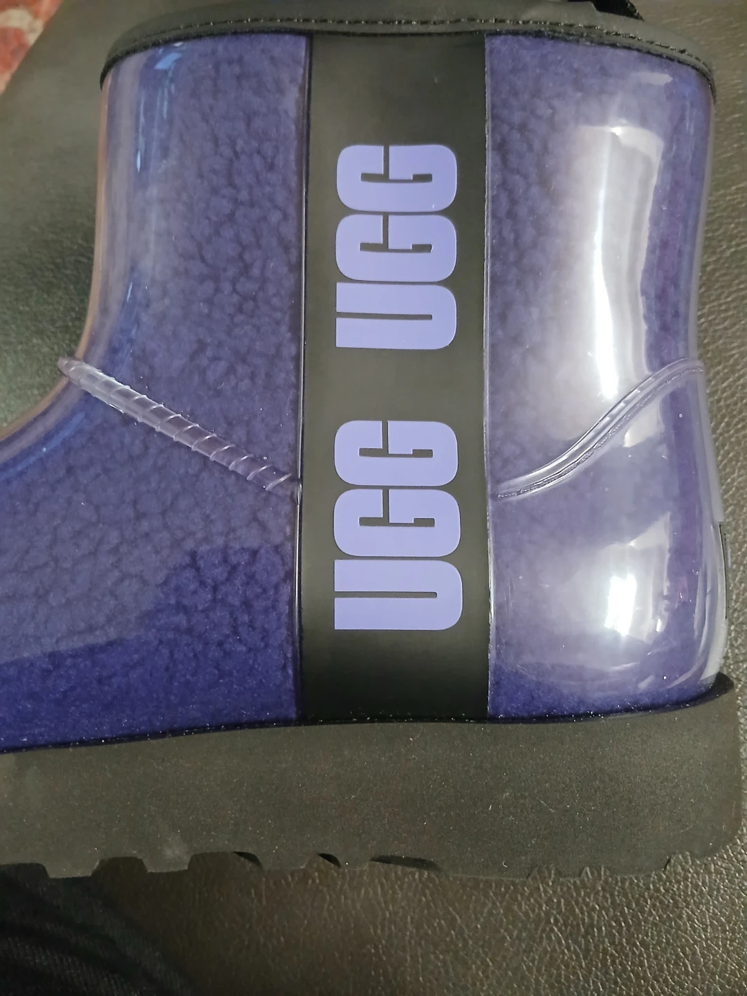 25Selling a pair of UGG boots in a unique purple clear design! These are super stylish and comfy for everyday wear. The UGG logo is visible on the side.