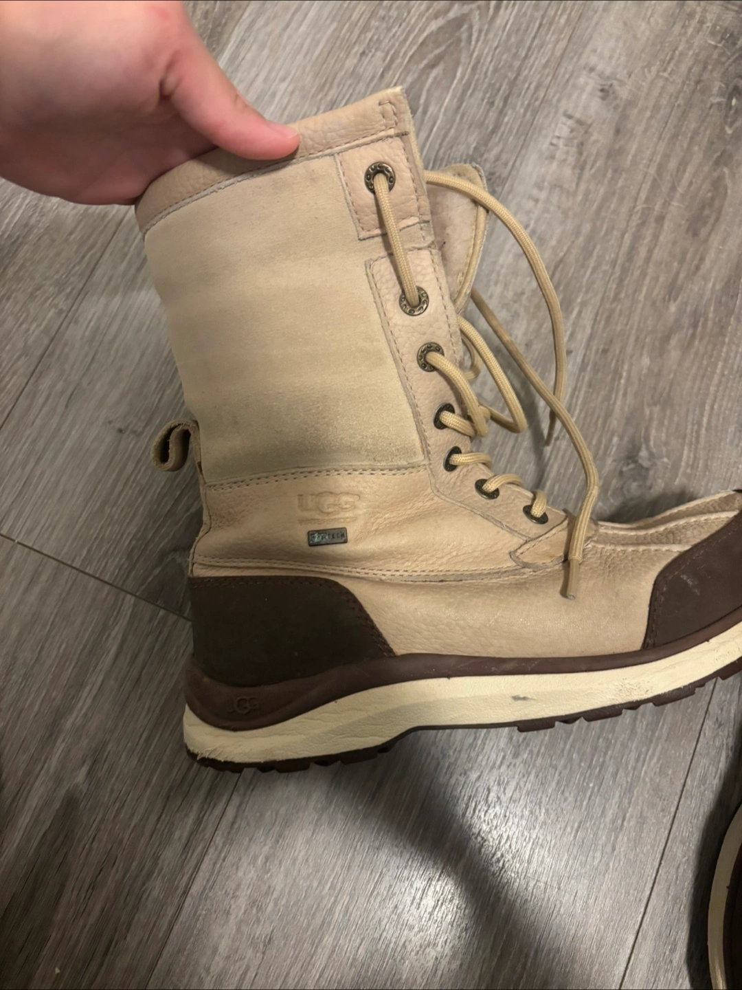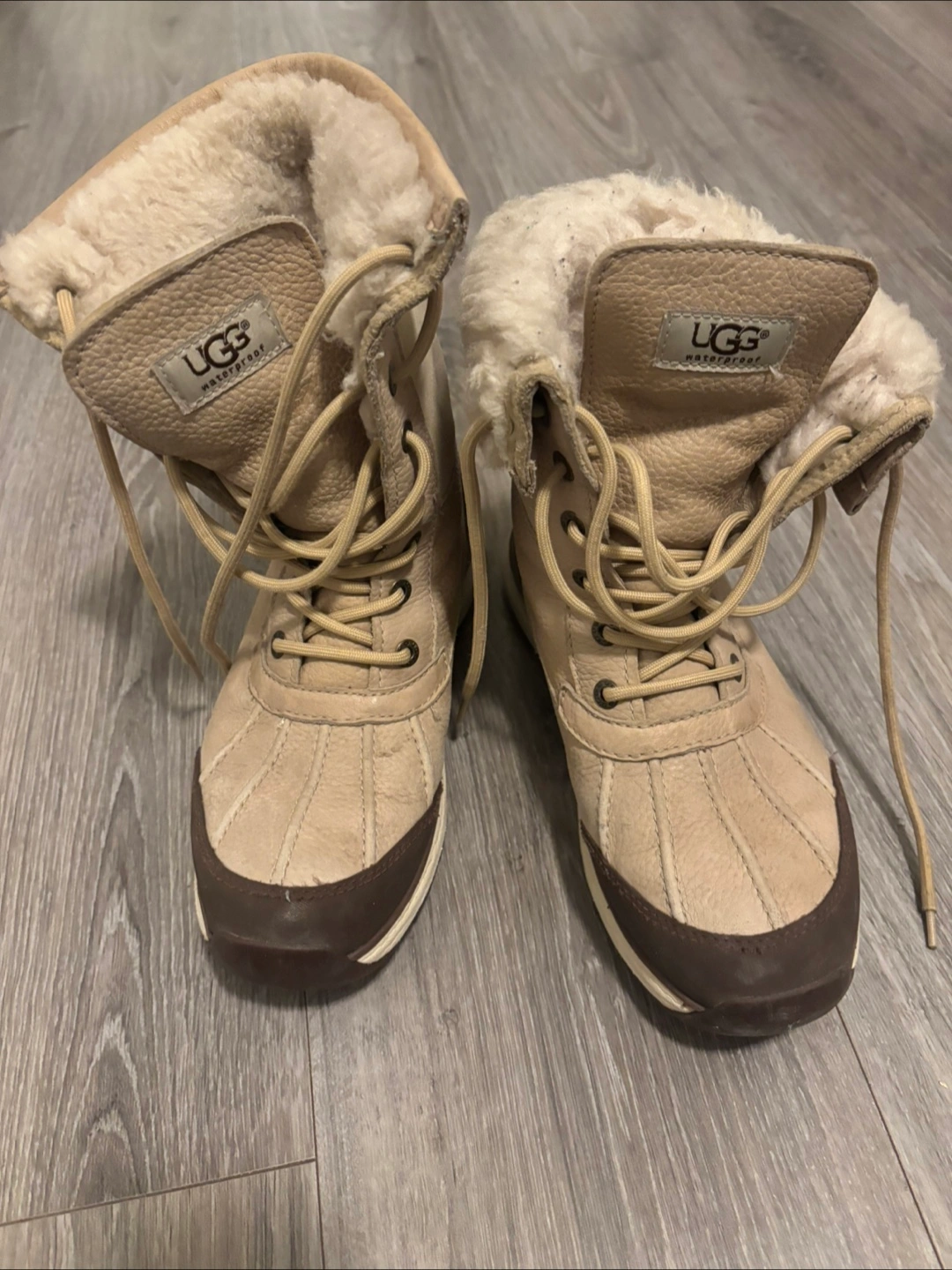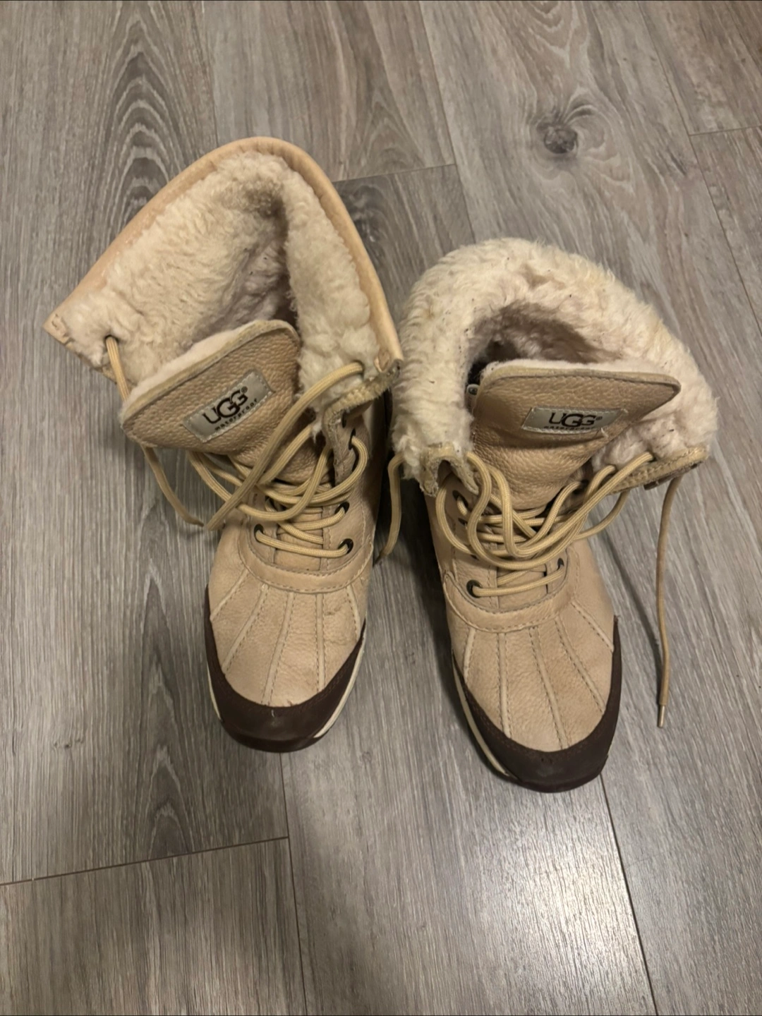 Adorable Women’s UGG winter boots. Tan leather exterior, warm fleece lining. Lace-up closure. Great for snow and cold weather. Pre-owned, minor wear.