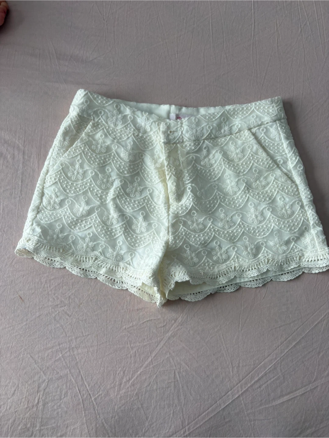 Cream coloured lace shorts with a scalloped hem. These shorts have a comfortable fit and a delicate lace overlay. Perfect for warmer weather!