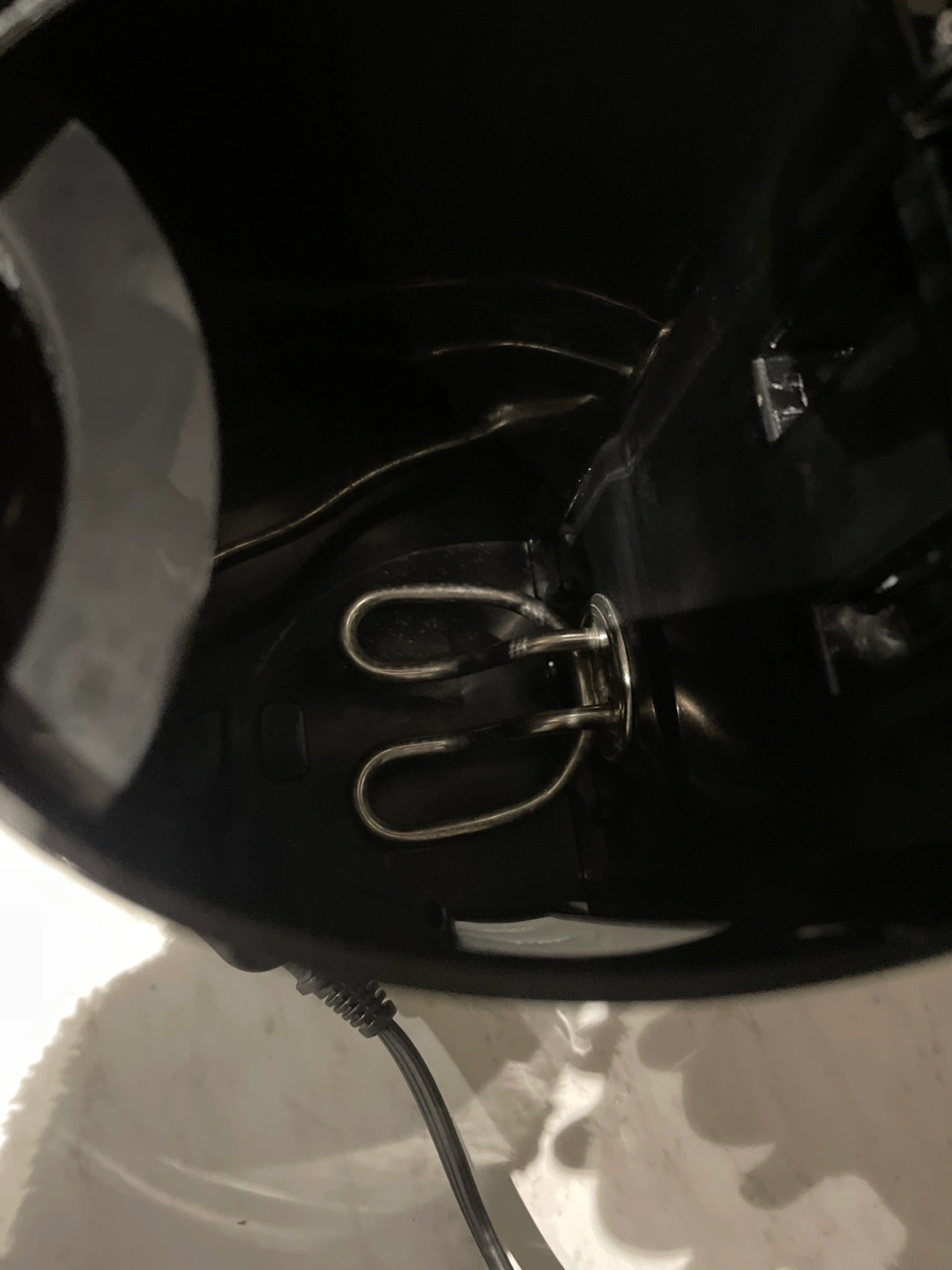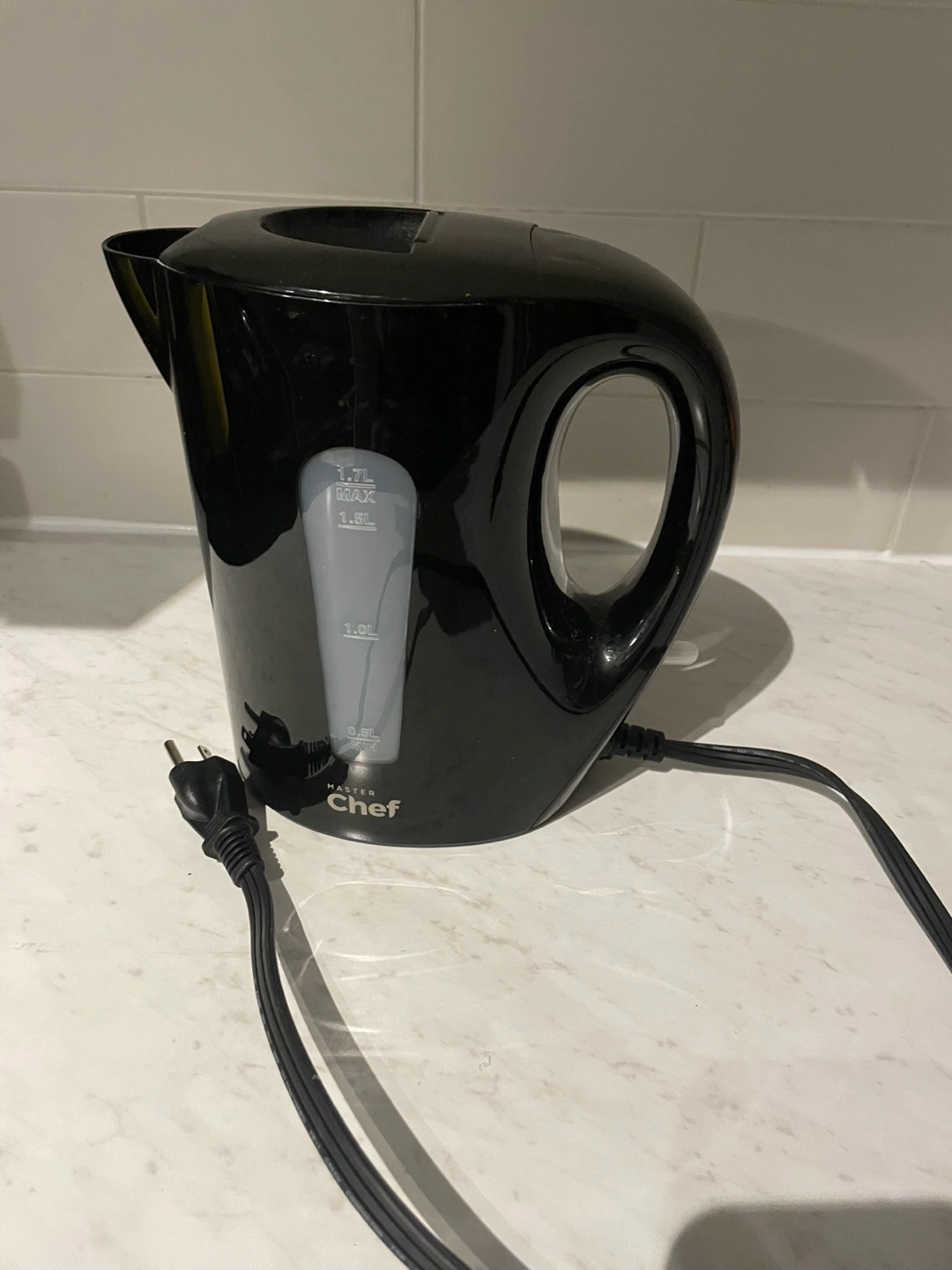 Master Chef electric kettle with a 1.7L capacity. Black plastic exterior. Has a water level indicator. Plugs into a standard outlet.