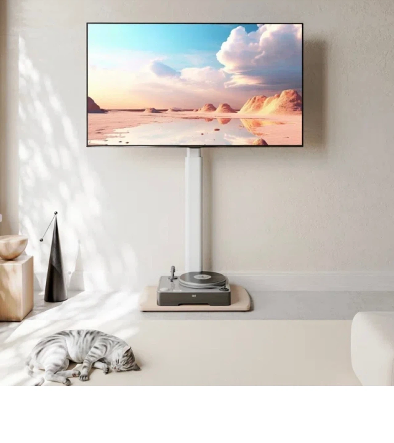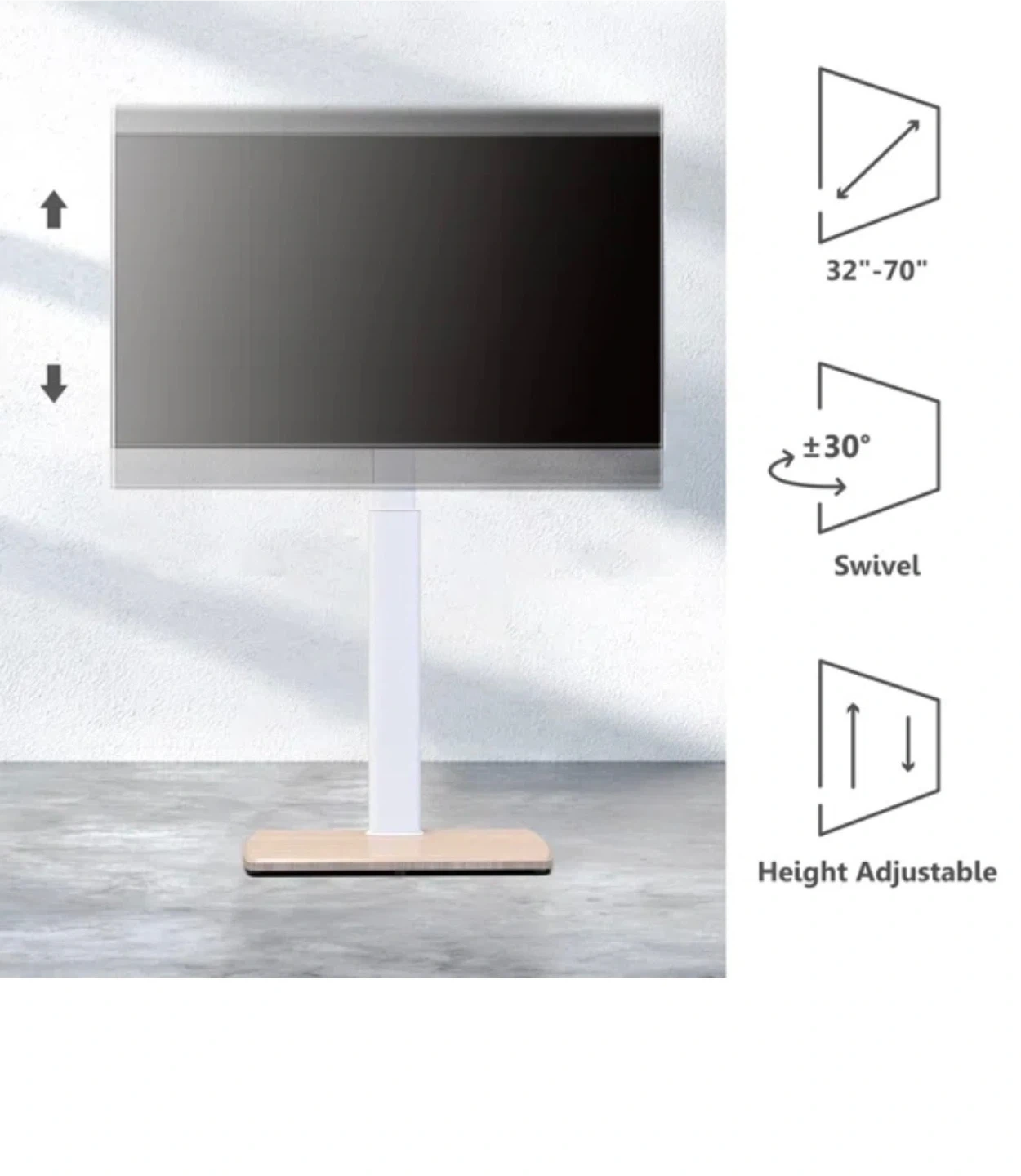 This TV stand fits TVs from 32" to 70" and supports up to 40kg/88lbs. It's height adjustable and swivels up to +/- 30 degrees. The base is made of high-quality wood with an elegant grain. It also includes cable management to keep things tidy!