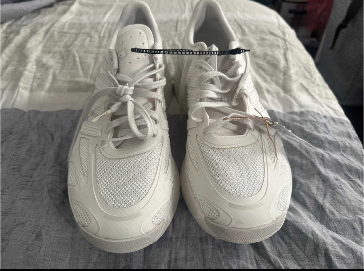 White Adidas Adizero Adios Pro 3 running shoes. US size 12. Features a lightweight mesh upper and responsive cushioning