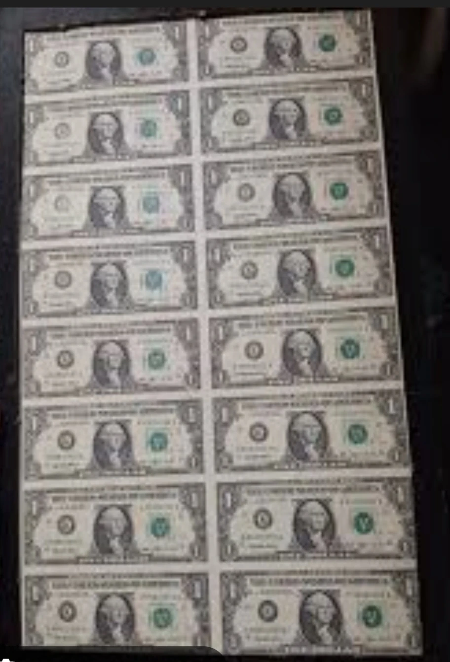 This is a sheet of sixteen one dollar bills. Each bill features George Washington. These are legal tender.