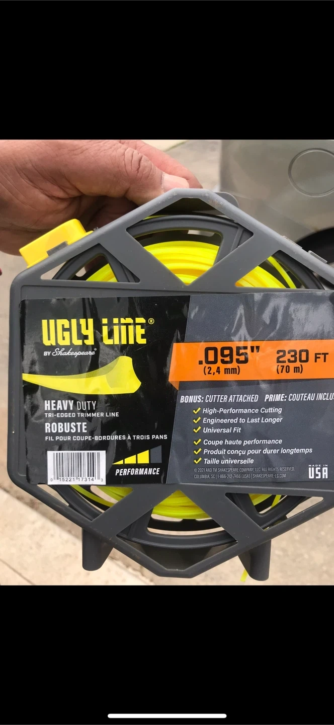 Selling a spool of Ugly Line by Shakespeare heavy-duty, tri-edged trimmer line. It measures .095" in diameter and has 230 ft (70 m) of line. This robust line is designed for high-performance cutting and is engineered to last longer, ensuring a universal fit for your trimmer