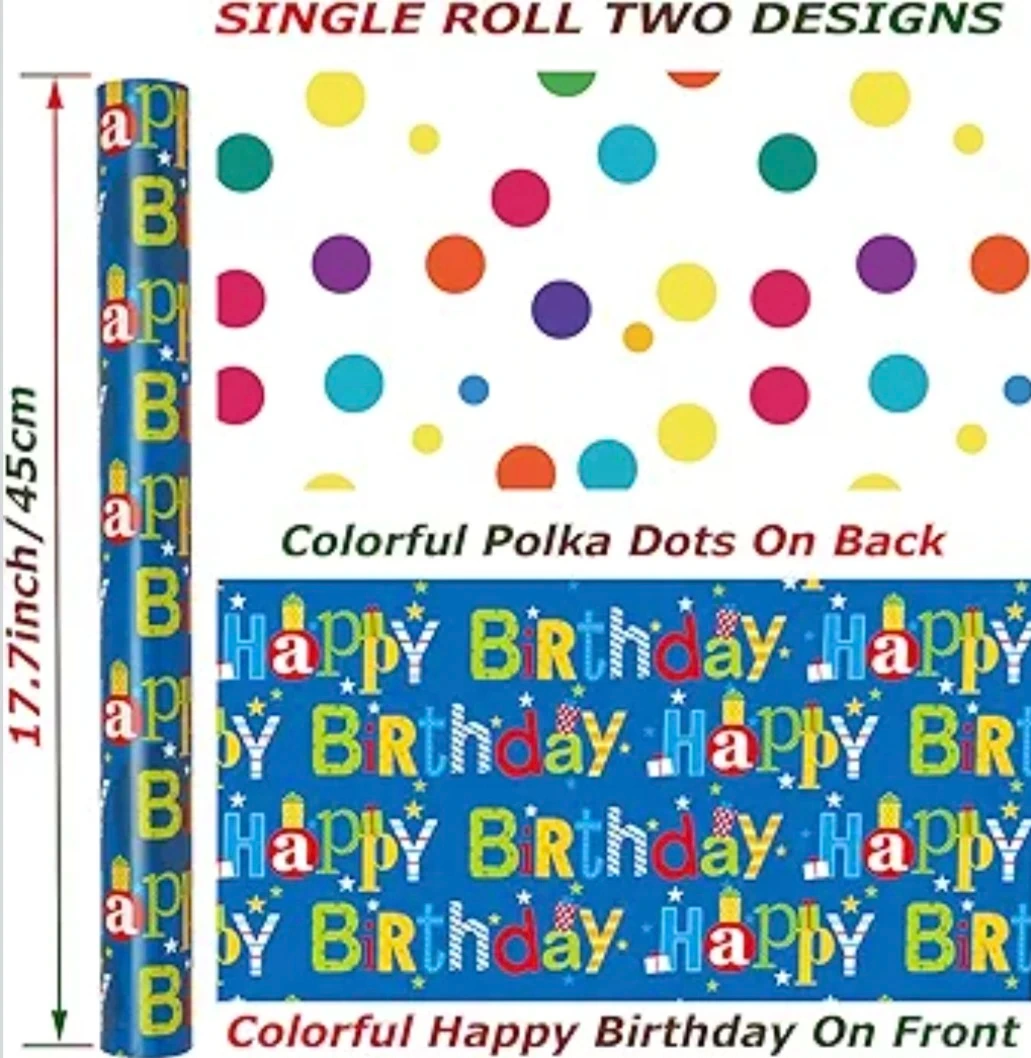 Reversible Happy Birthday Wrapping Paper Roll. Happy Birthday one side, Polka Dots Design on the other. New. Perfect for wrapping gifts for any birthday celebration. 17.7"×394"