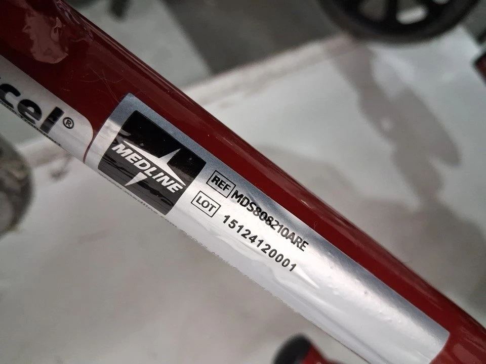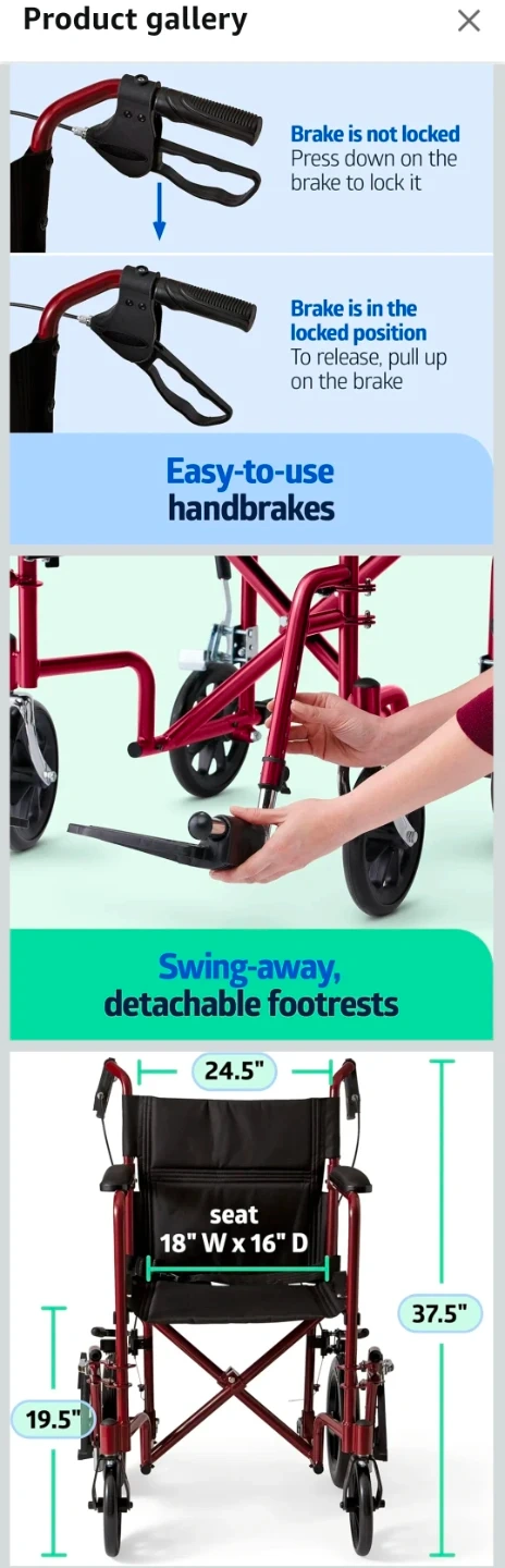 This is a Medline lightweight transport wheelchair, complete with handbrakes and folding capabilities, perfect for adults and featuring 12-inch wheels. π§βπ¦½π