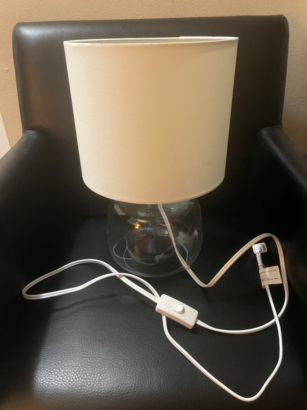 Selling a simple table lamp with a glass base and a white lampshade. It's in great condition and provides a soft, warm light. Perfect for a bedside table or desk!
