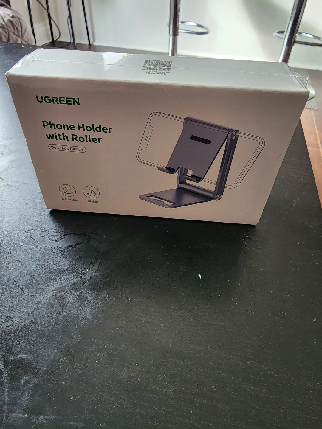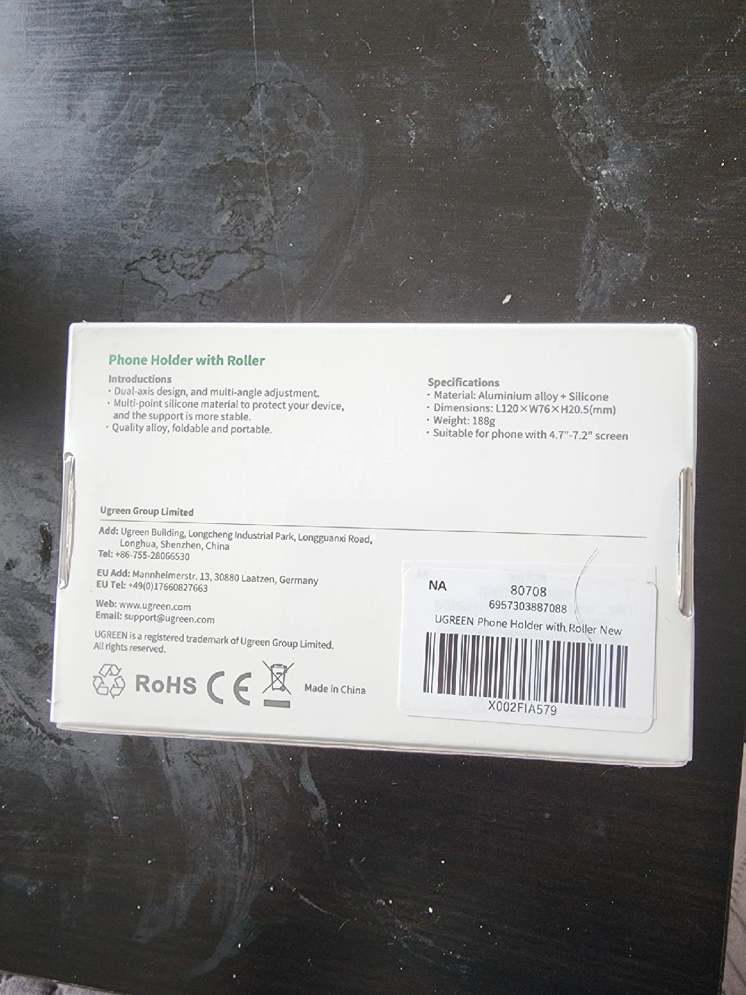 60This Ugreen phone holder with roller features a dual-axis design for multi-angle adjustment. It's made with quality alloy and is portable, perfect for desks or tables. Specifications: - Material: Aluminum alloy + Silicone - Dimensions: L120 x W76 x H20.5 (mm) - Weight: 188g - Suitable for phones with 4.7" - 7.2" screens