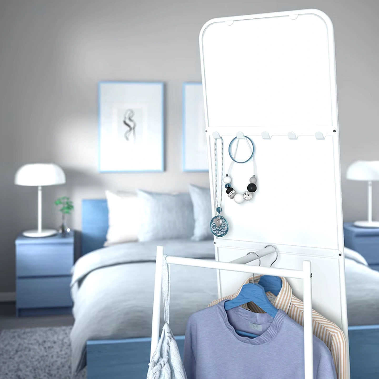 White full length mirror with a stand and hooks. Can be used as a dressing mirror or a storage solution for clothes and accessories.