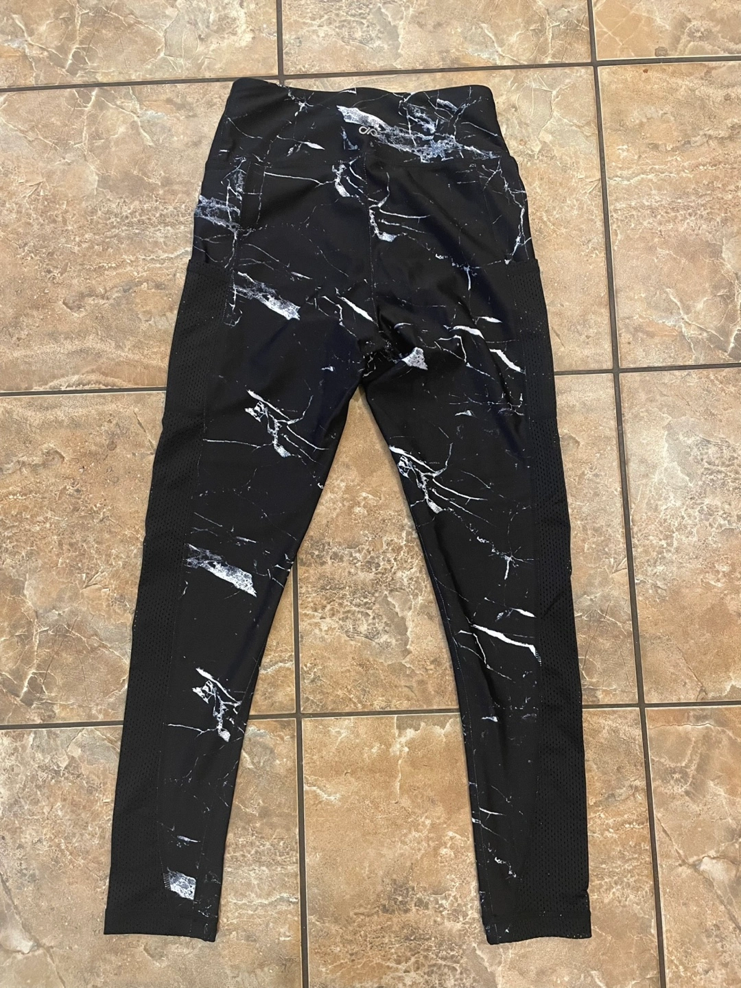 Women’s Infinite Performance black marble leggings, with side pockets and mesh panels on the sides.
