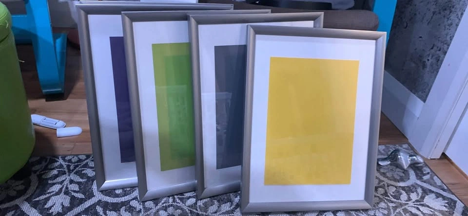 Selling 6 picture frames, size 17x13 inches, with an opening for 15 1/2 x 11 1/2 inch pictures. Two frames have minor scratches, while the rest are in perfect condition. They were previously used for framing old comic books.