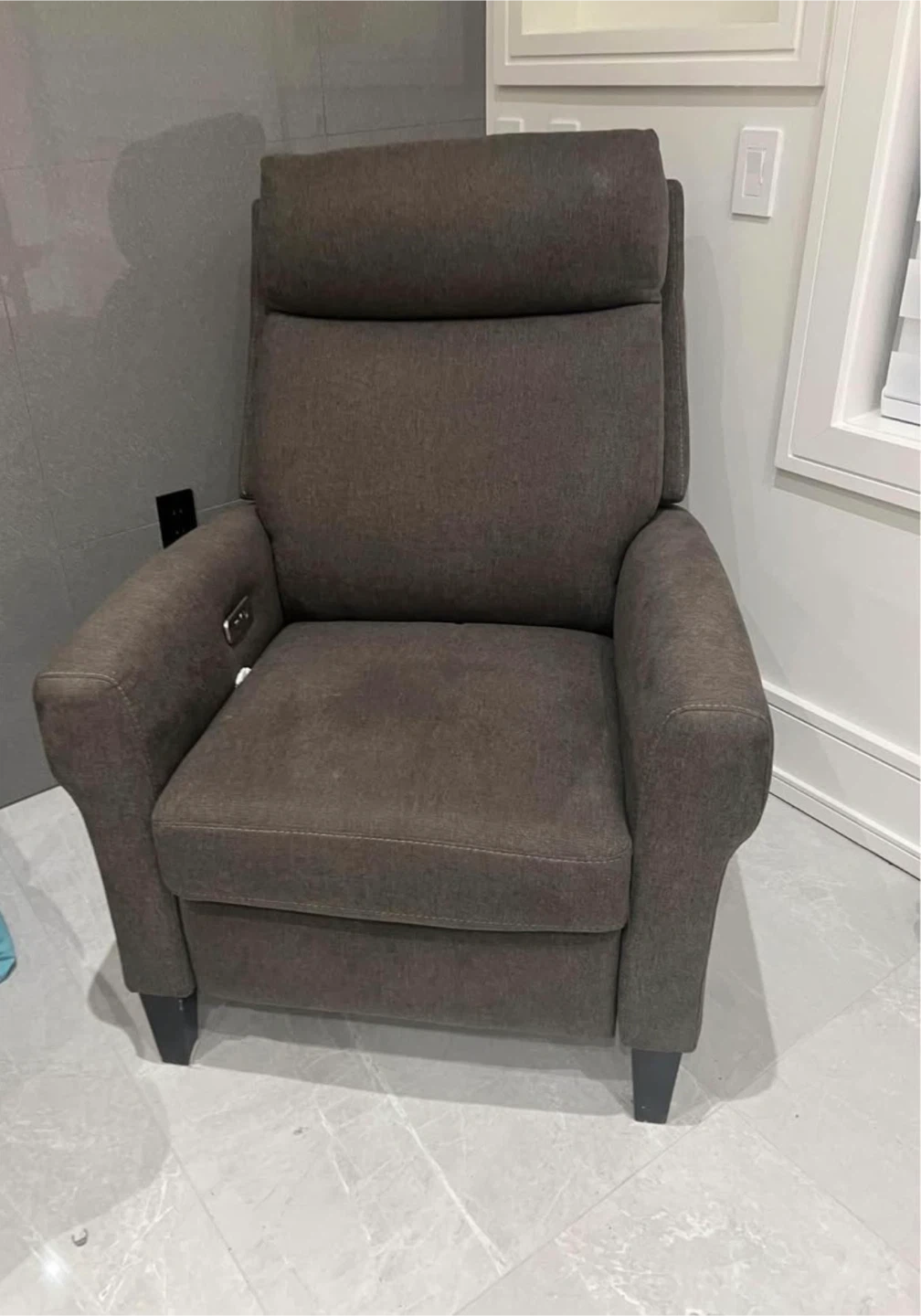 This is in a dark grey fabric. It features a plush headrest and padded armrests for comfort. The recliner has a convenient control panel on the side for easy operation. Fabric material.