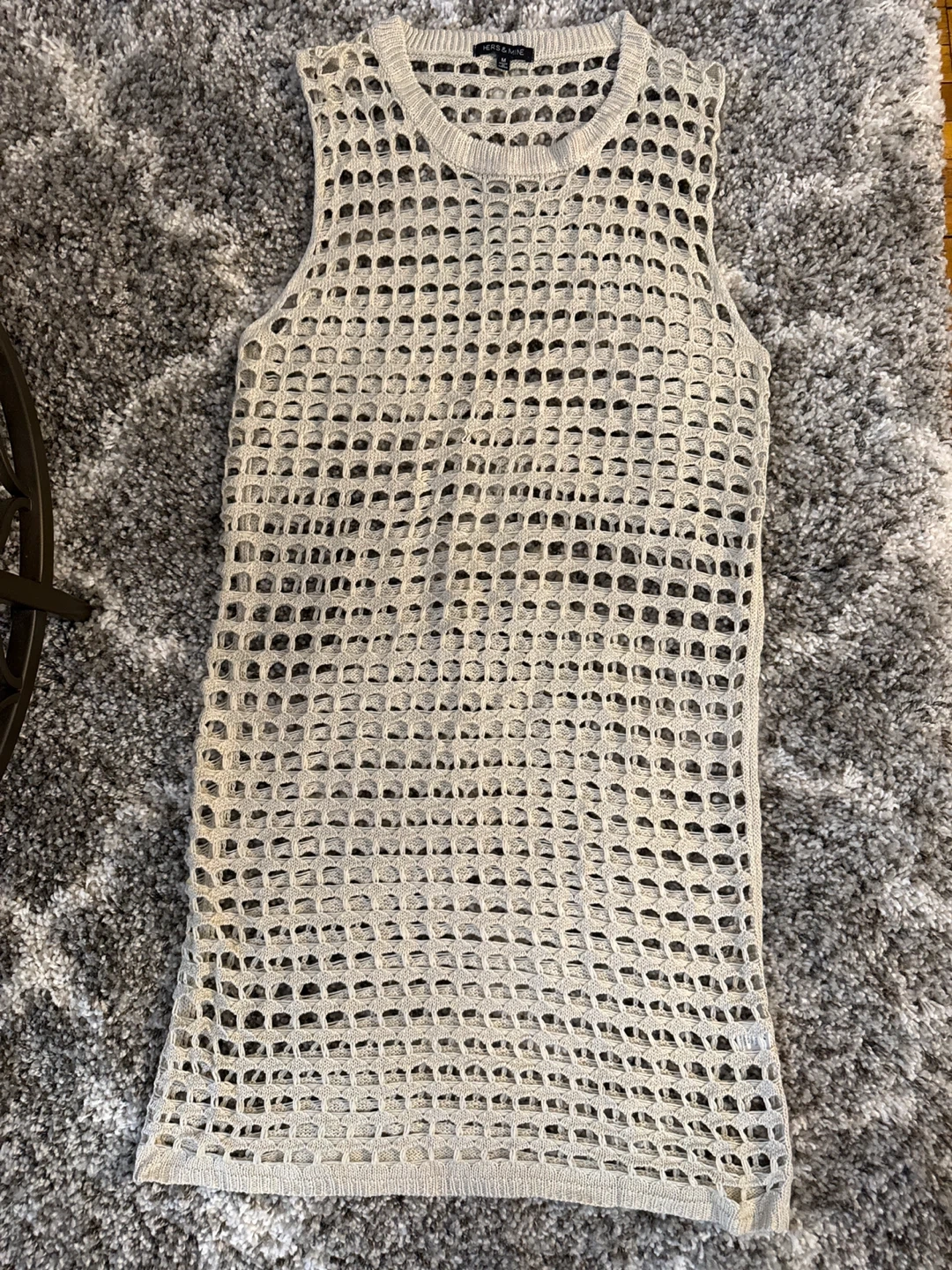 This is a light gray, sleeveless knit tank top. It features a unique open-knit pattern throughout. Made from a blend of cotton and acrylic. Size medium.