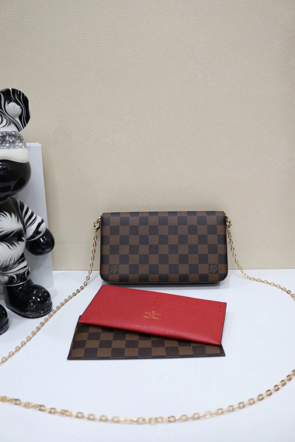 This Louis Vuitton Pochette Felicie is crafted from Damier Ebene canvas and features a gold-tone chain strap. It includes a red interior cardholder. It's a stylish and versatile accessory for your essentials!