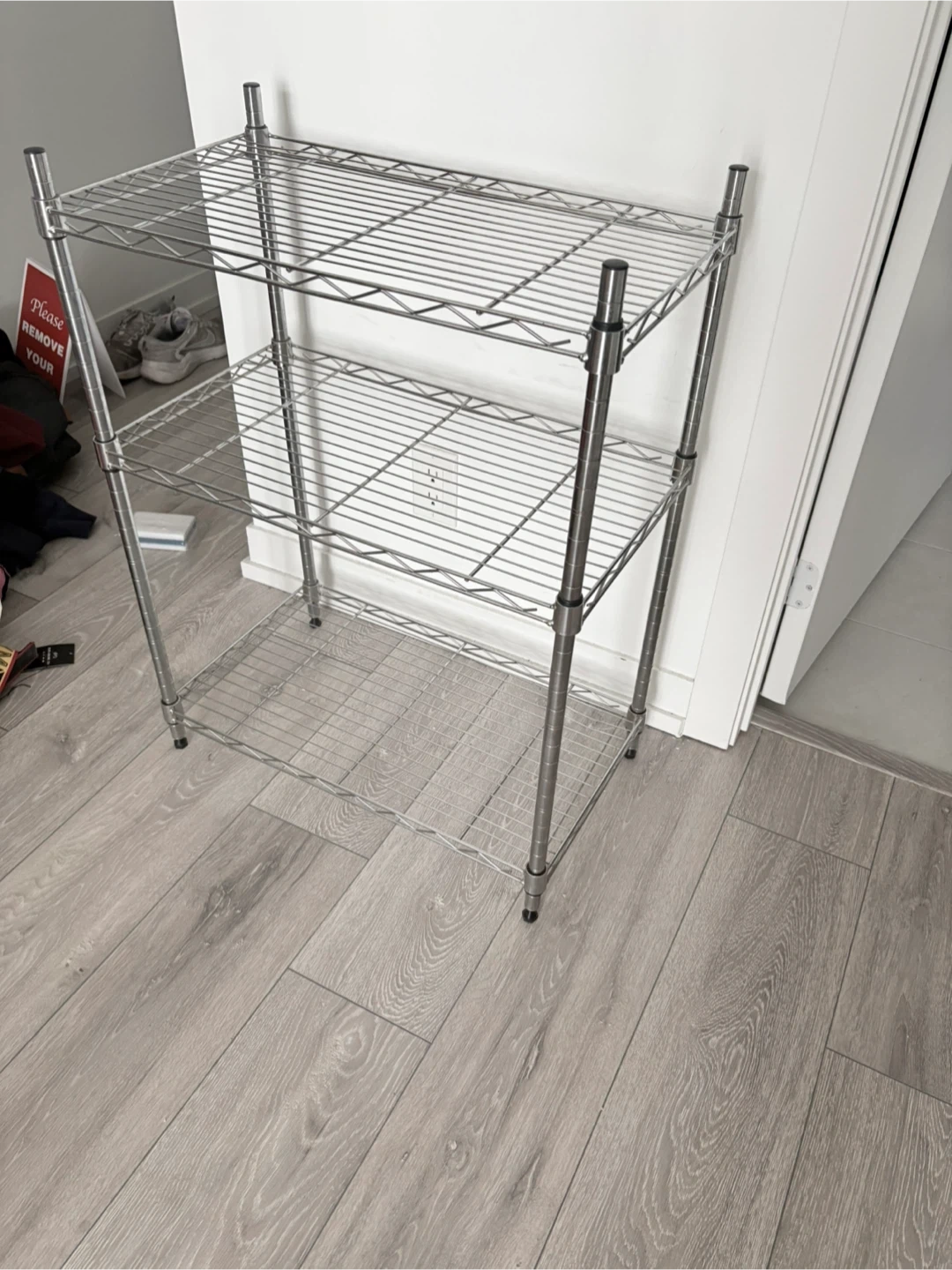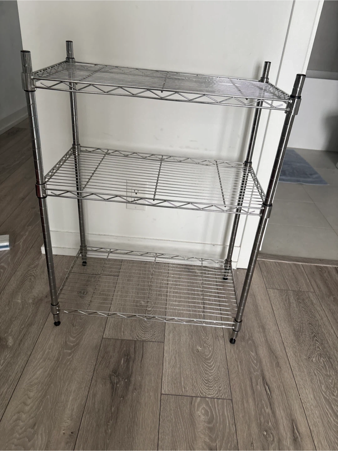 This is a 3-tier chrome wire shelving unit. It's made of metal with adjustable shelves. Perfect for organizing storage in a garage, kitchen, or office!