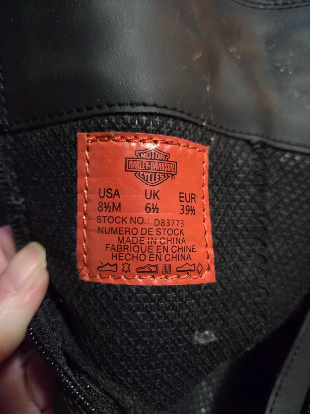 These are black leather Harley-Davidson riding boots. They are a women's size 8.5M (UK 6.5, EUR 39.5). The boots feature side zippers and buckle details.
