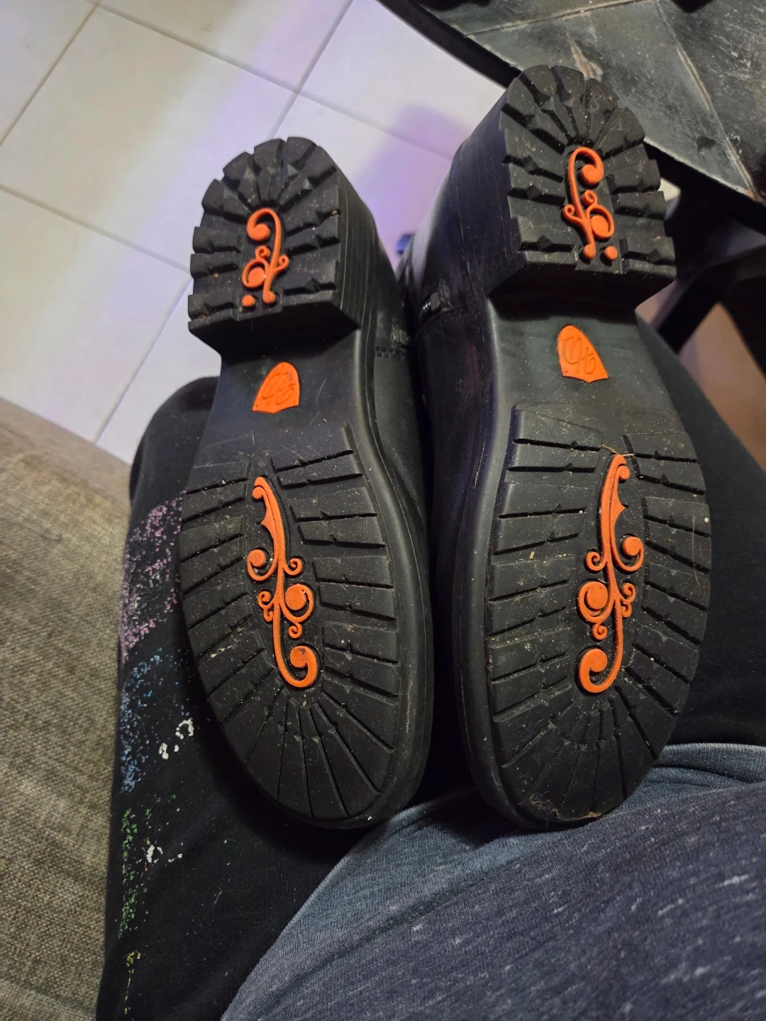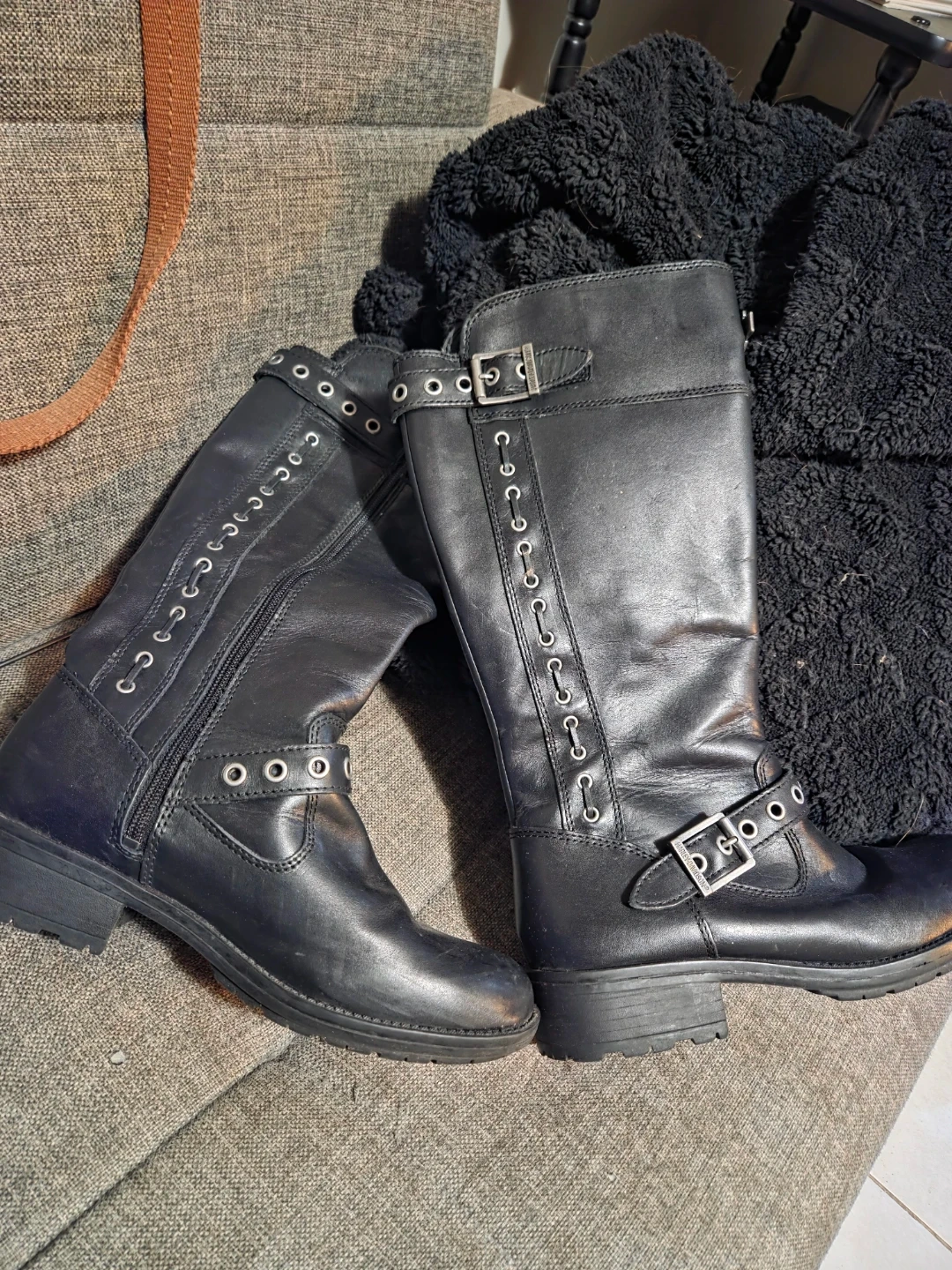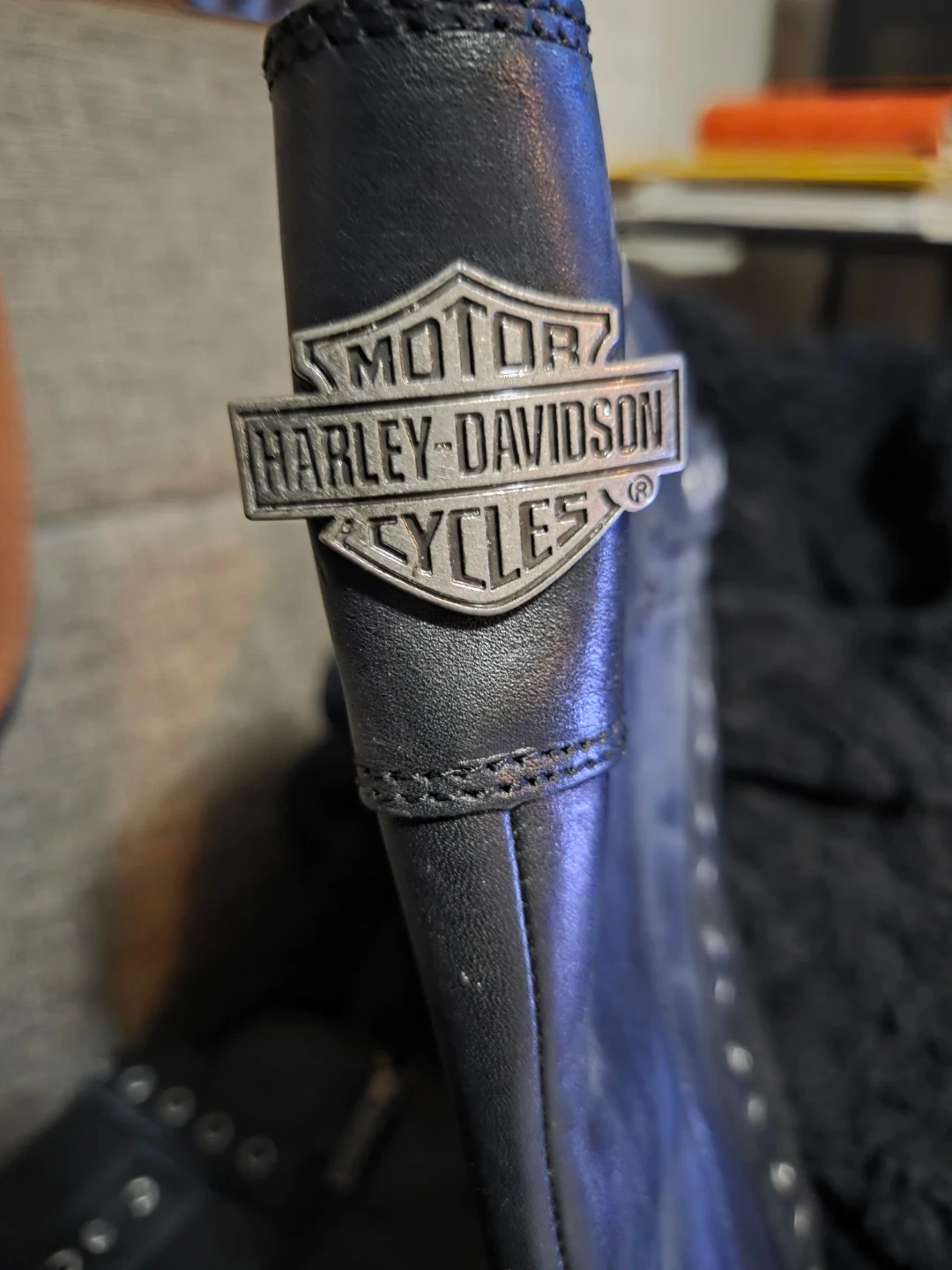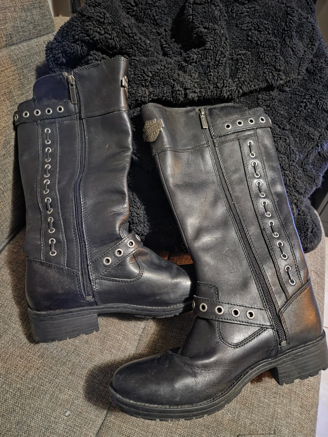 These are black leather Harley-Davidson riding boots. They are a women's size 8.5M (UK 6.5, EUR 39.5). The boots feature side zippers and buckle details.