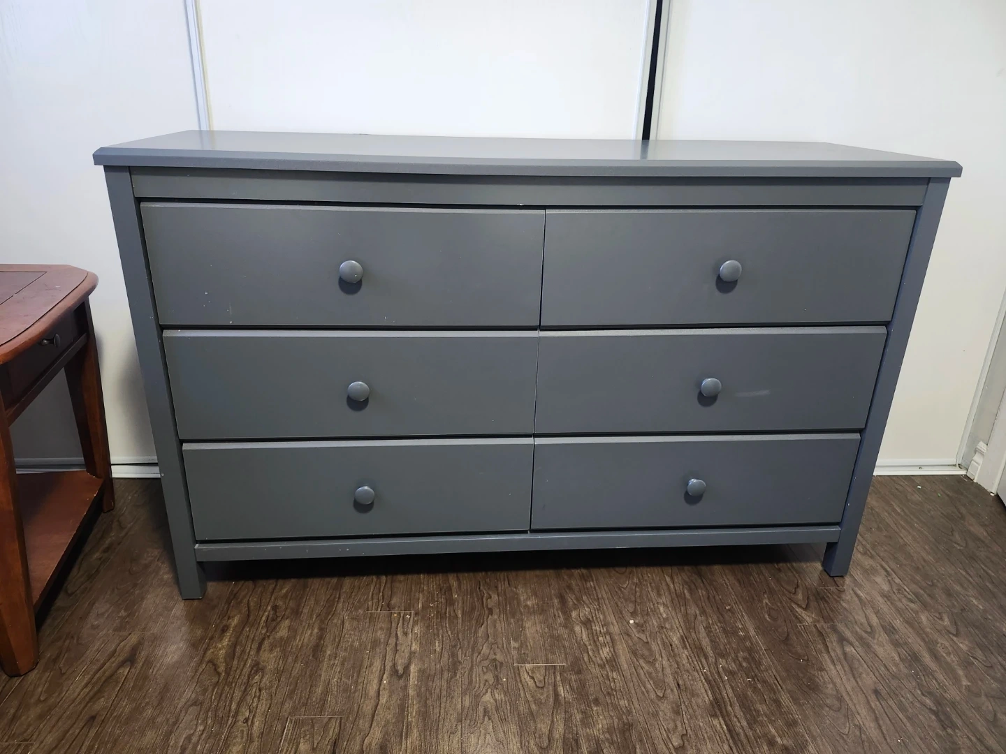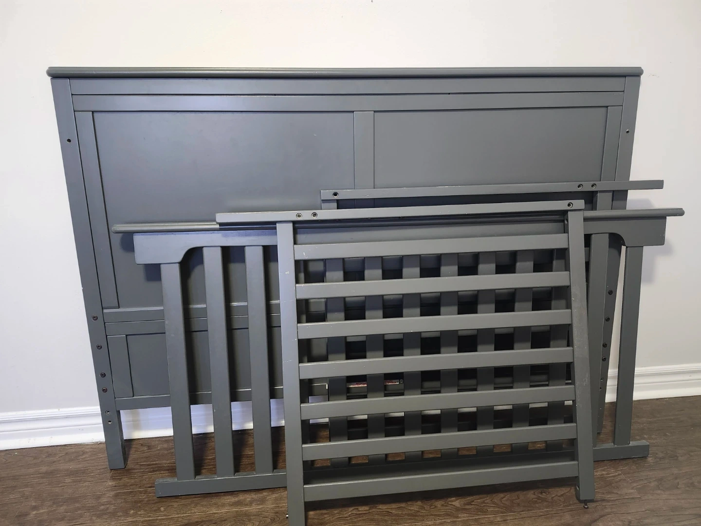 This set includes a grey baby crib and changing station with multiple shelves and a matching grey dresser with six drawers. Both pieces are made of wood and have a neutral grey finish. The changing station has a safety strap for securing your baby. Mattress included