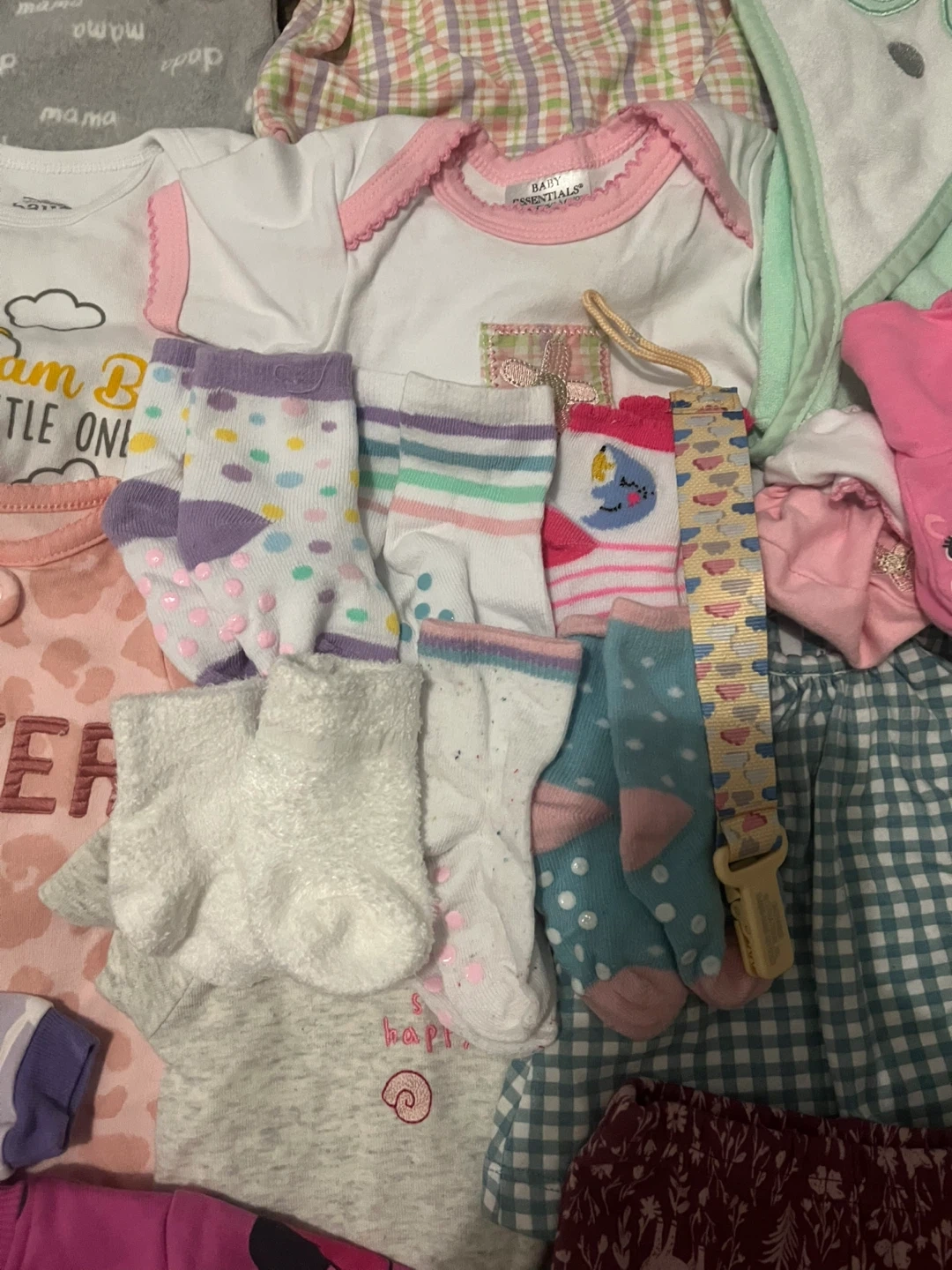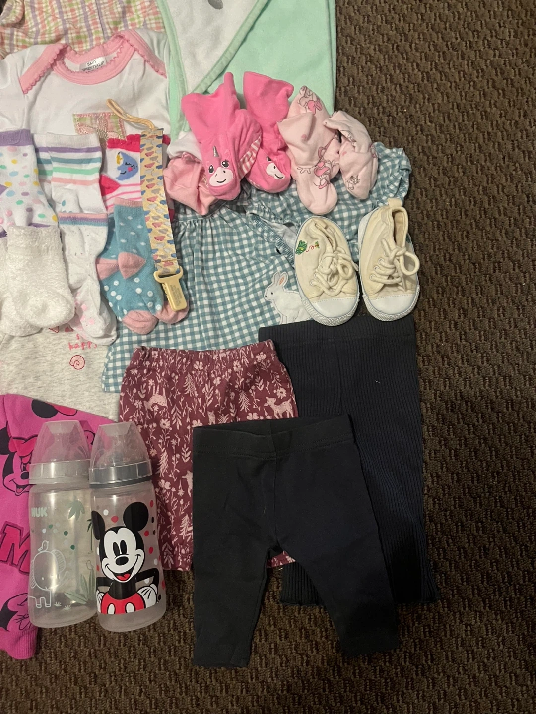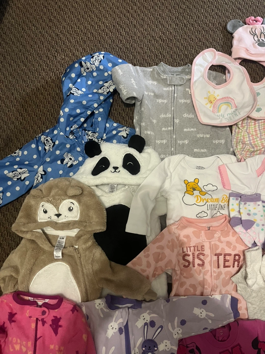 This is a bundle of baby girl clothes featuring Disney characters like Minnie Mouse and Winnie the Pooh. It includes a onesie, footie pajamas, pants, a jacket, a hat, bibs, socks and 2 bottles and many more Great for everyday wear or as a gift!