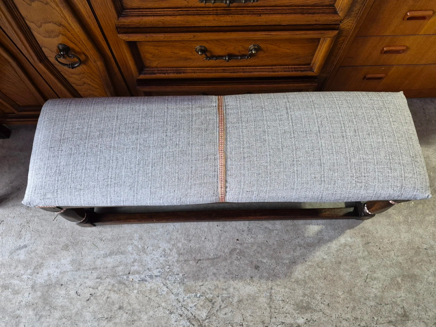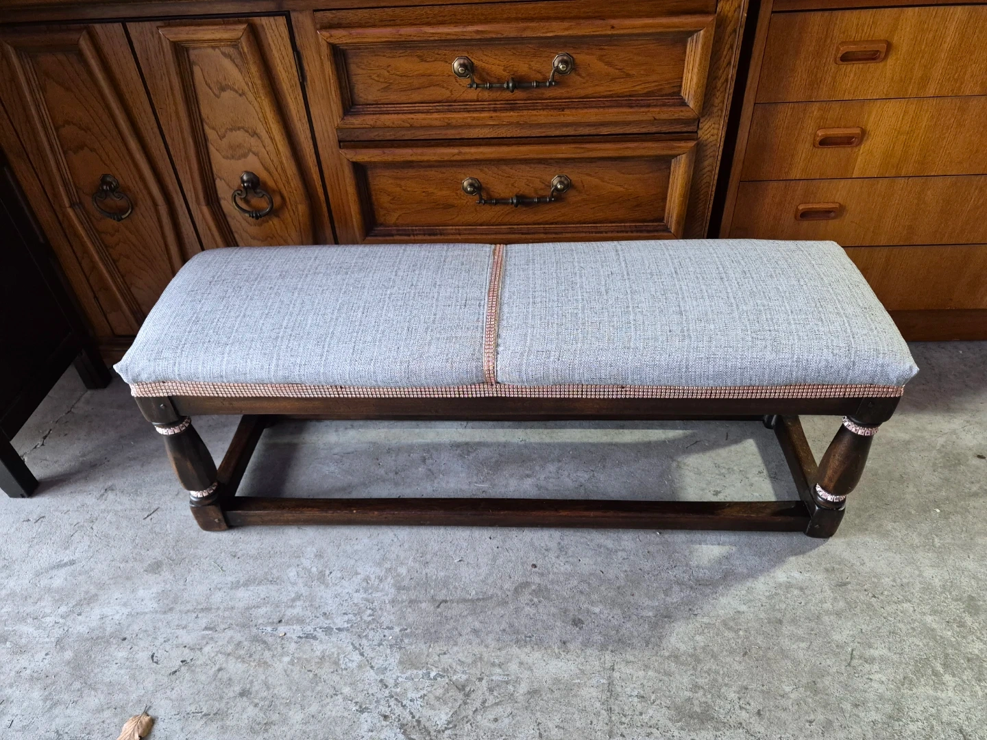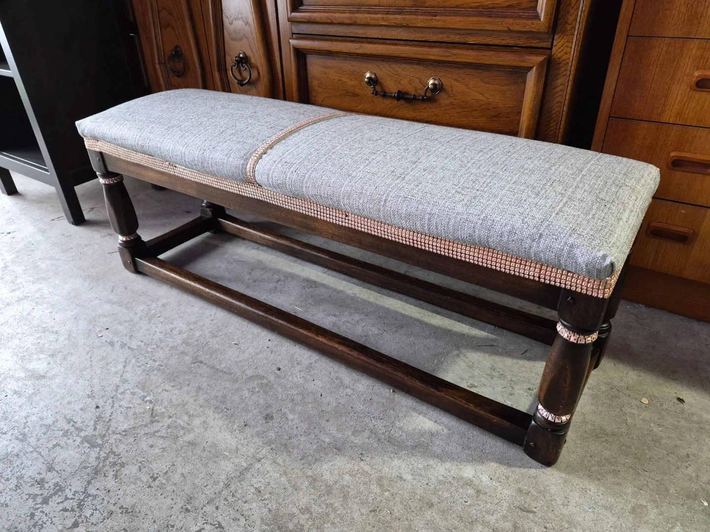 This upholstered bench features a grey woven fabric seat and dark wooden legs. It's accented with a decorative pink trim along the seat edge and on the legs. This bench offers a nice spot to sit or can be used as a decorative piece.