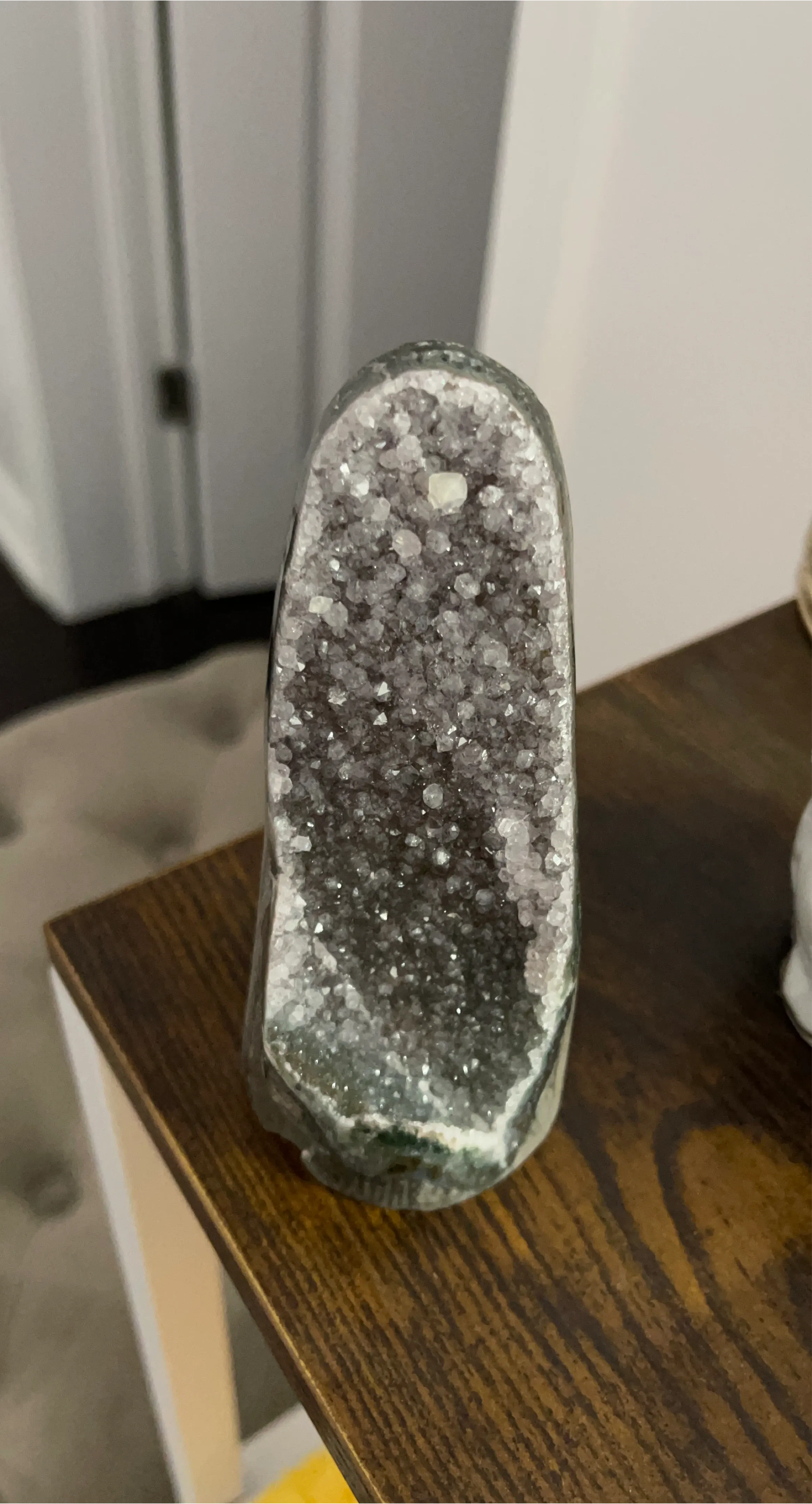 A beautiful amethyst geode with crystal formations. It's roughly carved on the outside and polished to a smooth finish. This piece displays natural purple and white crystal clusters within its cavity. It's a lovely decorative item for any space!