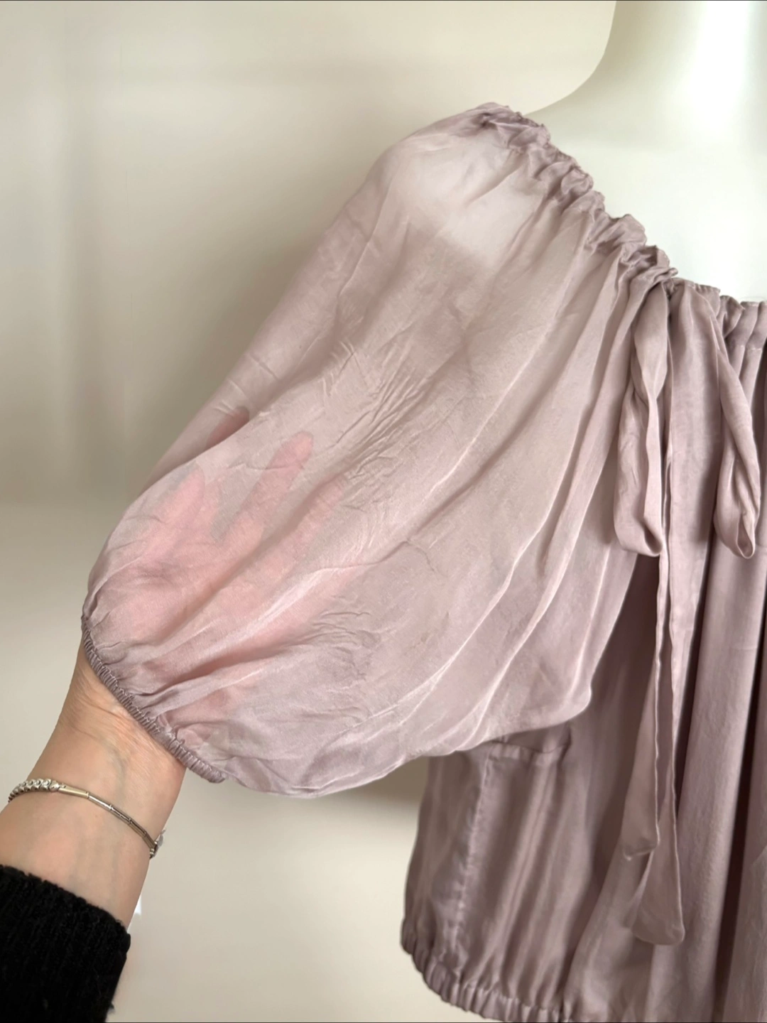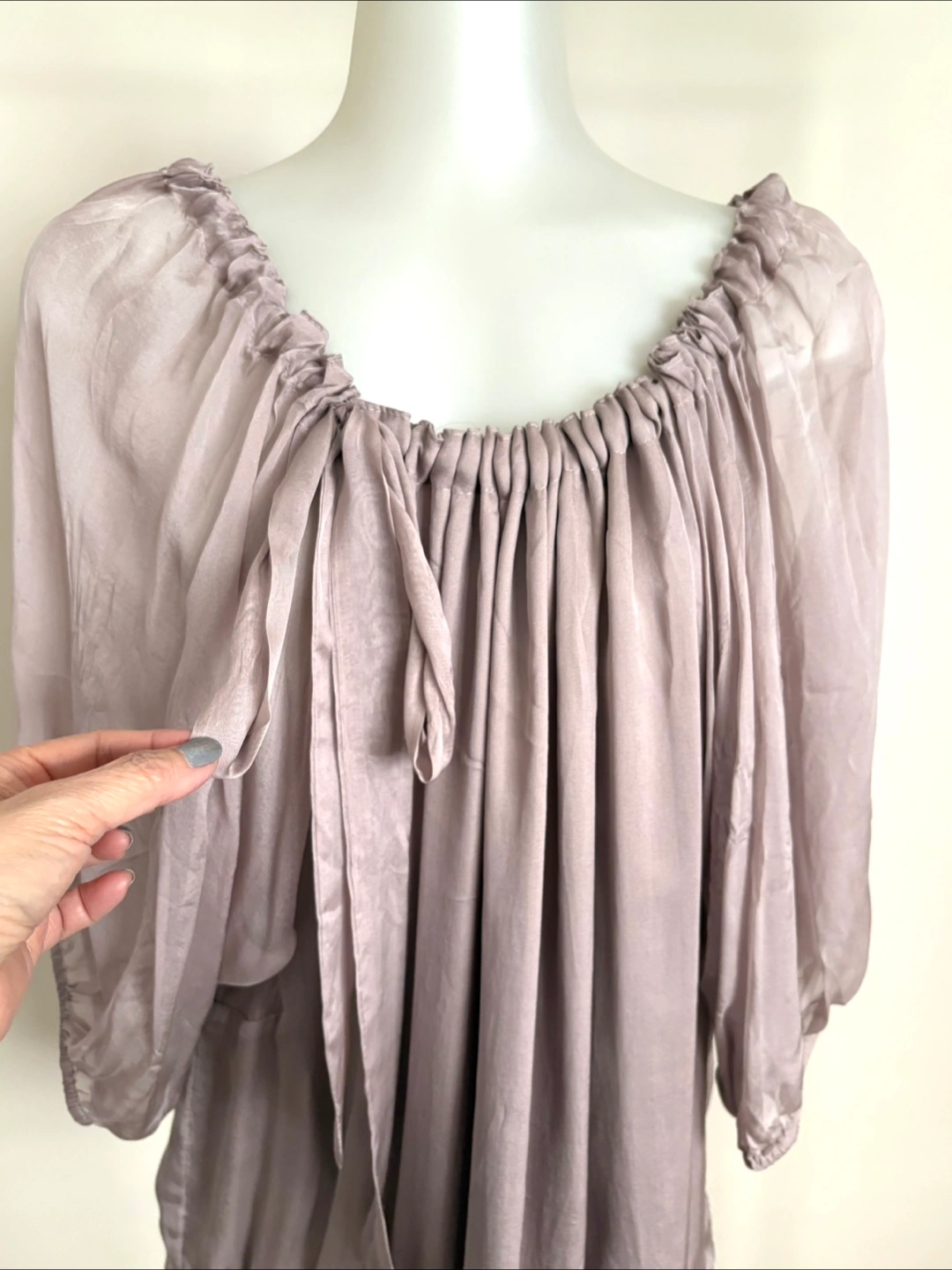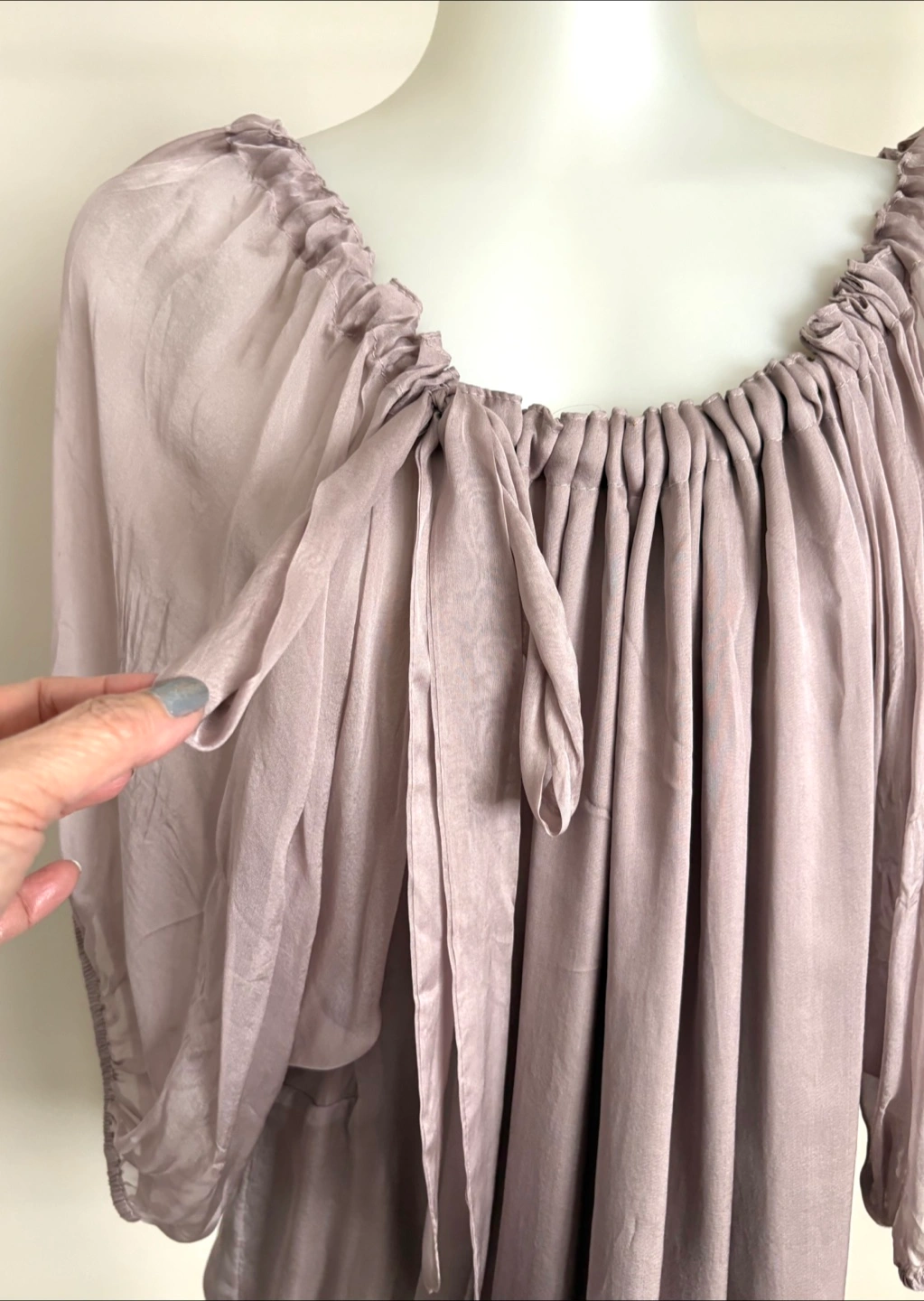 Lightweight silk blouse with a gathered neckline and tie detail.