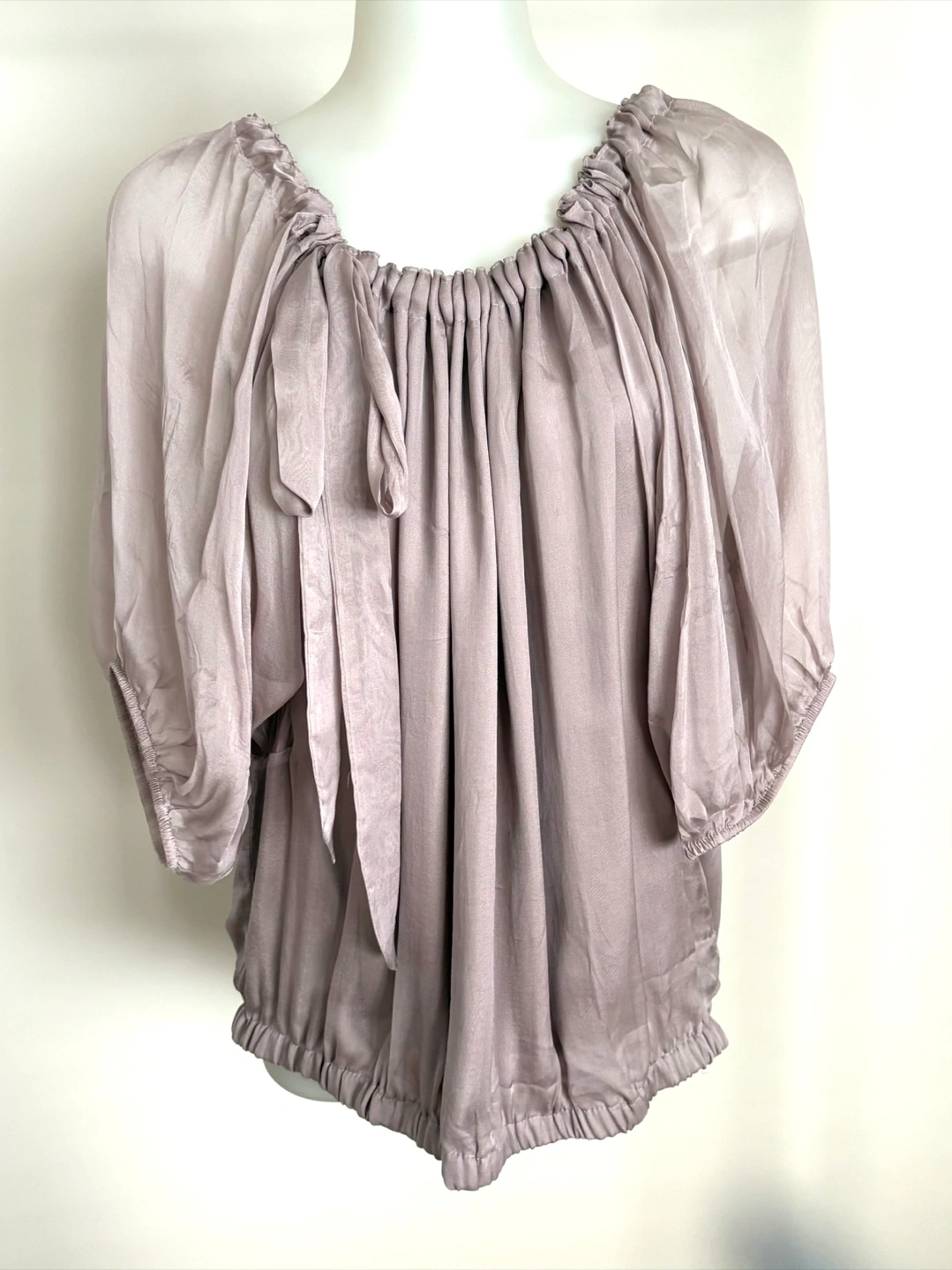 Lightweight silk blouse with a gathered neckline and tie detail.