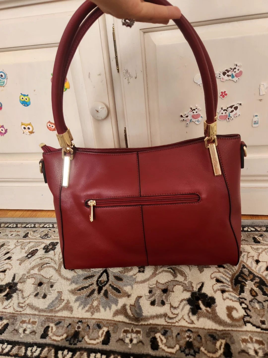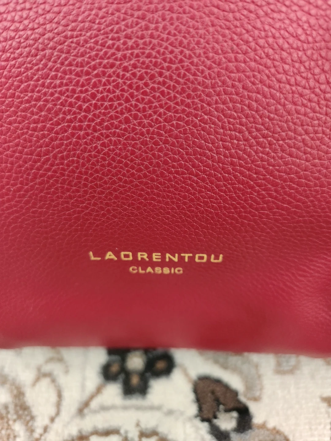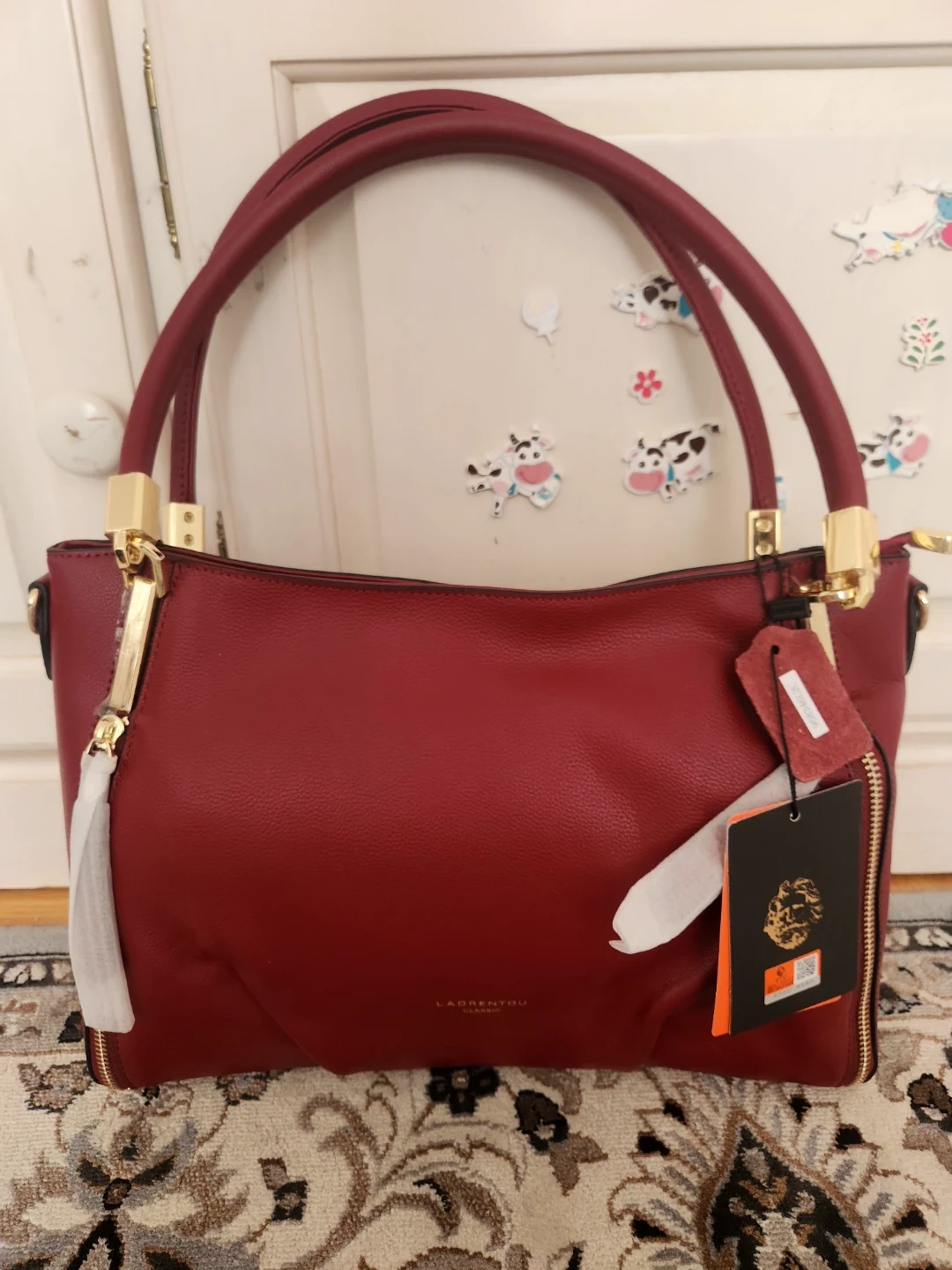 This is a LAURENTOU CLASSIC handbag. It's a deep red colour with gold accents. The bag has a zippered main compartment and an exterior zippered pocket. It's perfect for everyday use!