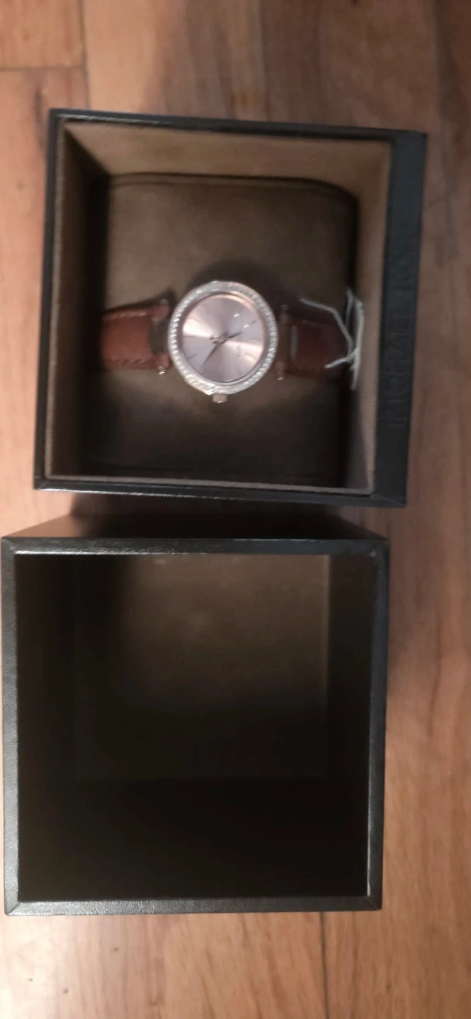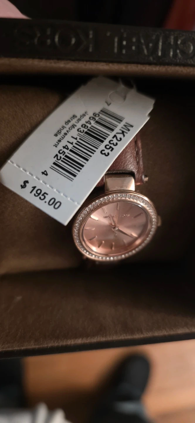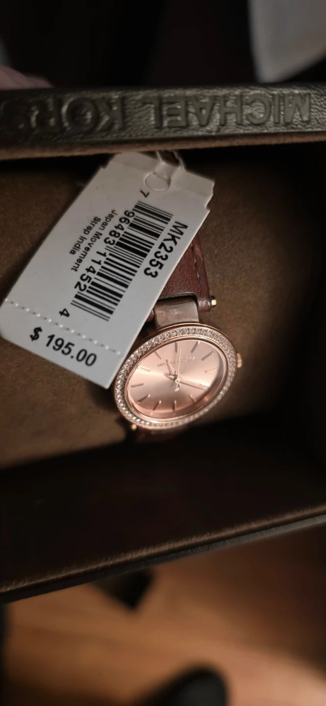 Michael Kors women's rose gold tone watch. Features a rose gold dial with crystal accents on the bezel and a brown leather strap. Includes original box and tag. Needs a new battery selling it for a low price makes a great gift