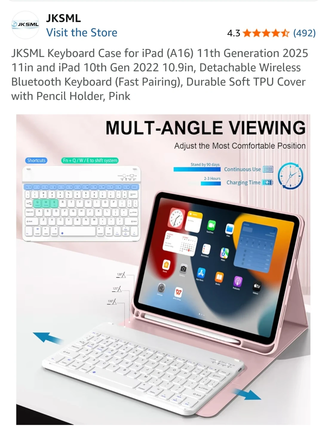 Selling a JKŞML keyboard case in pink for iPad 10th Gen 10.9in and iPad (A16) 11th Gen 11in. It's a detachable wireless Bluetooth keyboard with a soft TPU cover. The case offers multi-angle viewing and includes a pencil holder.