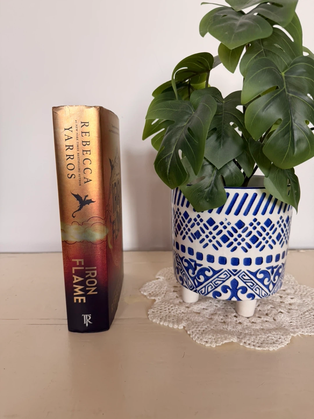 This is the 'Iron Flame' hardcover book with gorgeous sprayed edges by Rebecca Yarros! It is the second book in the bestselling Empyrean series. A perfect read for fantasy lovers!