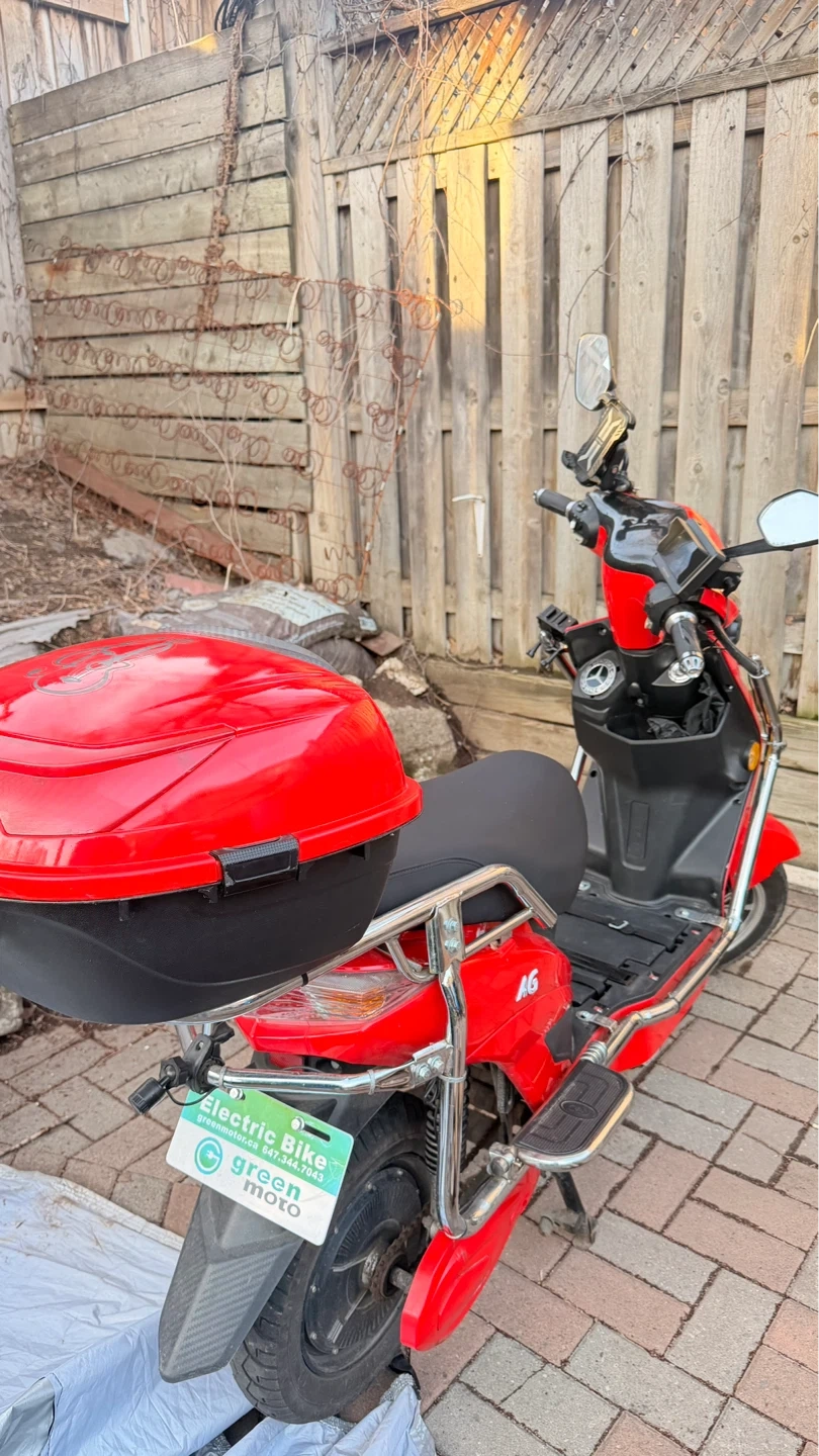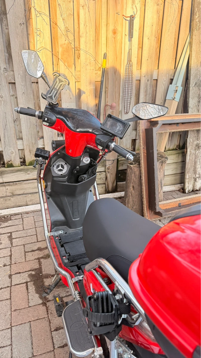 Red electric scooter with a front storage compartment and a rear cargo box. It's designed for easy urban commuting. Comes with mirrors and a phone mount.