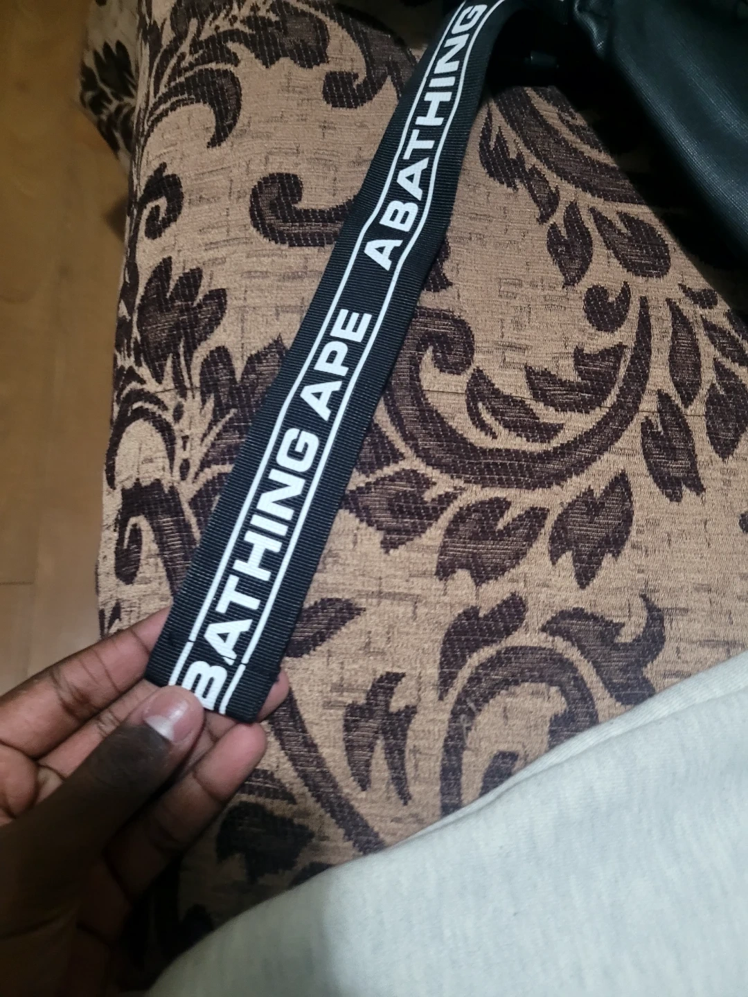 This is a black fanny pack from A Bathing Ape. It has the iconic ape head logo printed on the front and 'A BATHING APE' text on the strap. The strap is adjustable with a buckle closure.