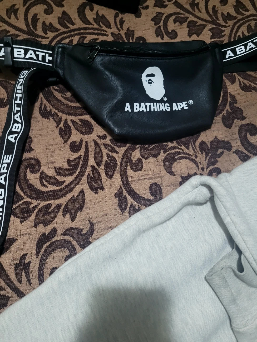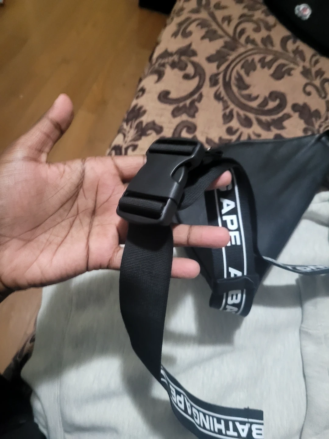 This is a black fanny pack from A Bathing Ape. It has the iconic ape head logo printed on the front and 'A BATHING APE' text on the strap. The strap is adjustable with a buckle closure.