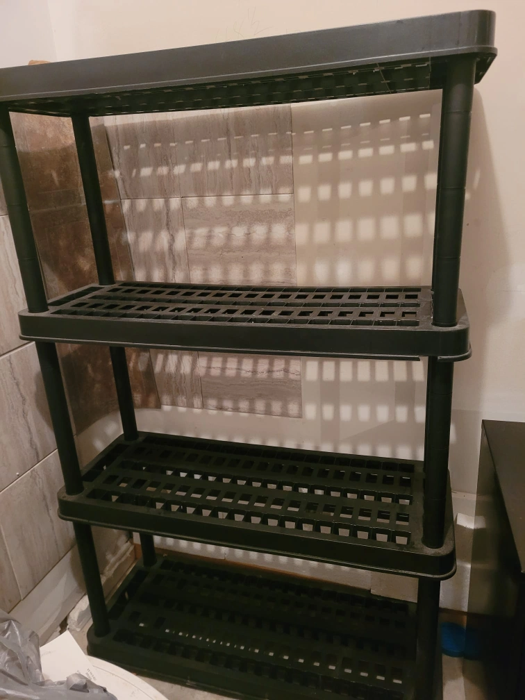 Selling a black 4-tier plastic shelving unit. It's perfect for organizing any space in your home, from the garage to the pantry. Lightweight and easy to assemble, this shelving unit offers ample storage while being durable and easy to clean. Great for keeping your items tidy and accessible.