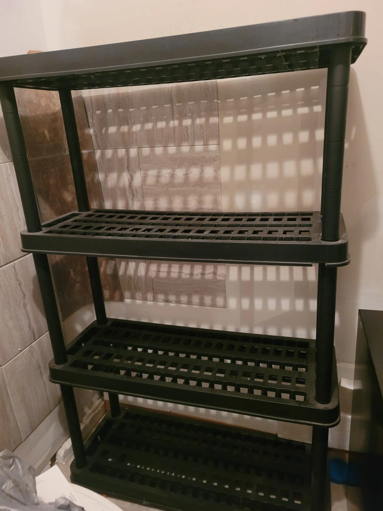 Selling a black 4-tier plastic shelving unit. It's perfect for organizing any space in your home, from the garage to the pantry. Lightweight and easy to assemble, this shelving unit offers ample storage while being durable and easy to clean. Great for keeping your items tidy and accessible.