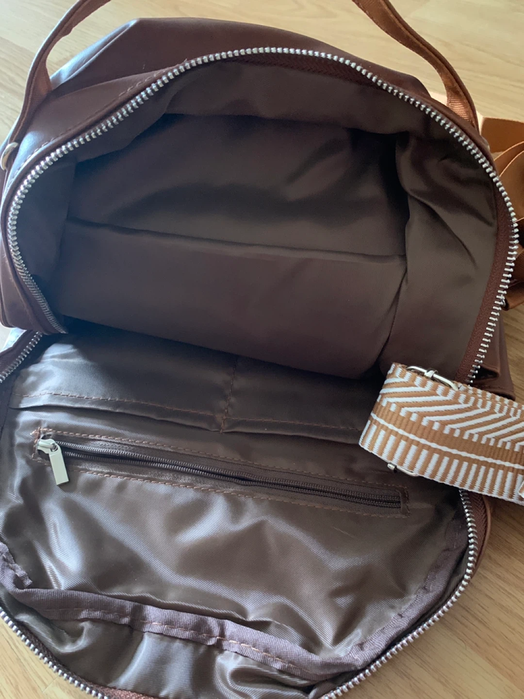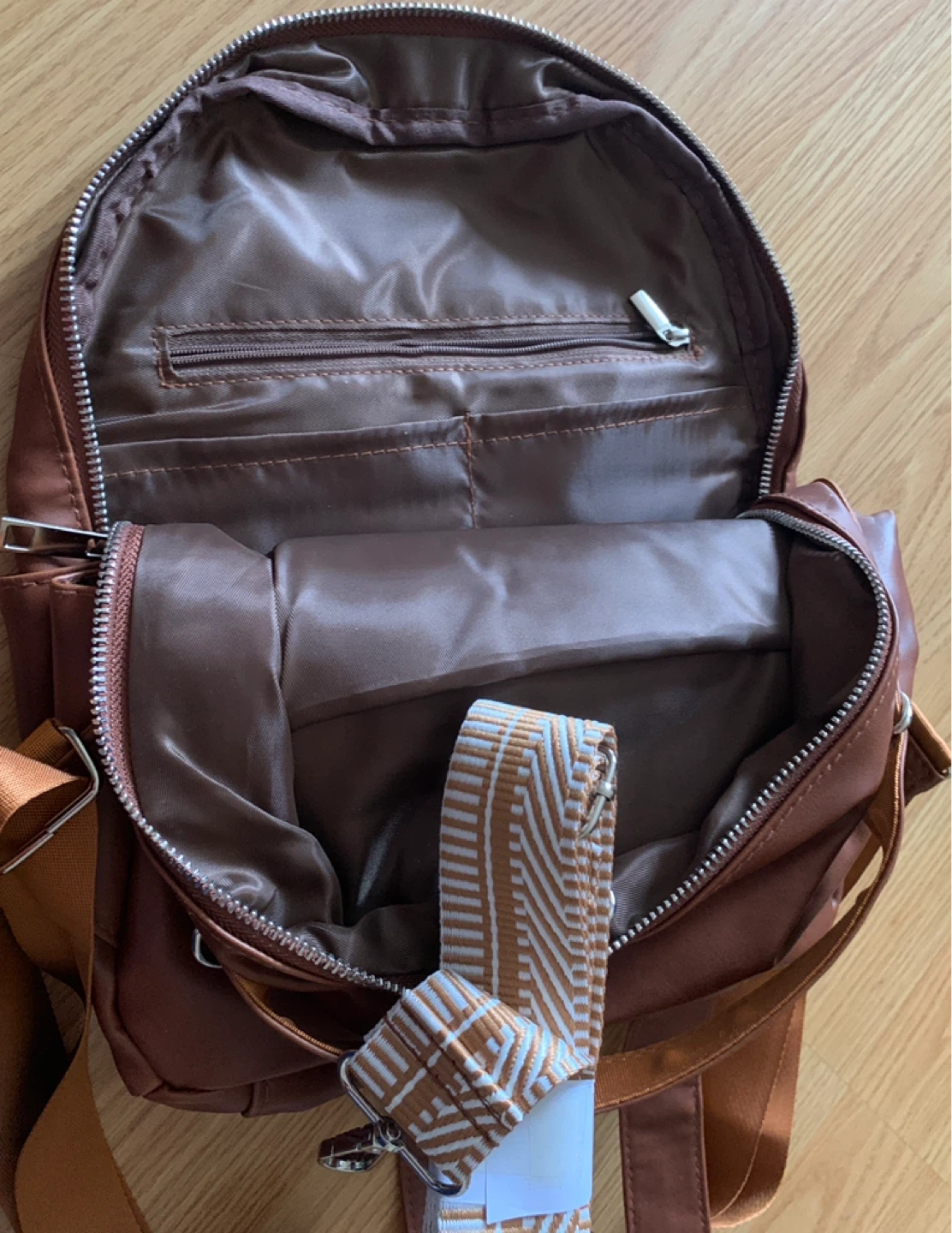 This mini backpack is made of faux leather in a rich brown colour. It features a main compartment with an interior zip pocket and a front zip pocket. It comes with adjustable shoulder straps and an extra decorative strap, Brand New