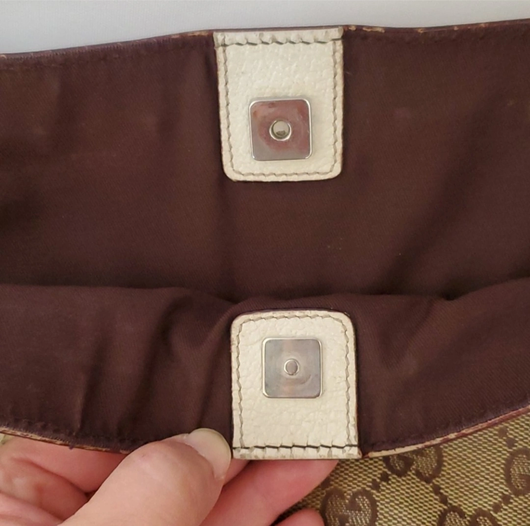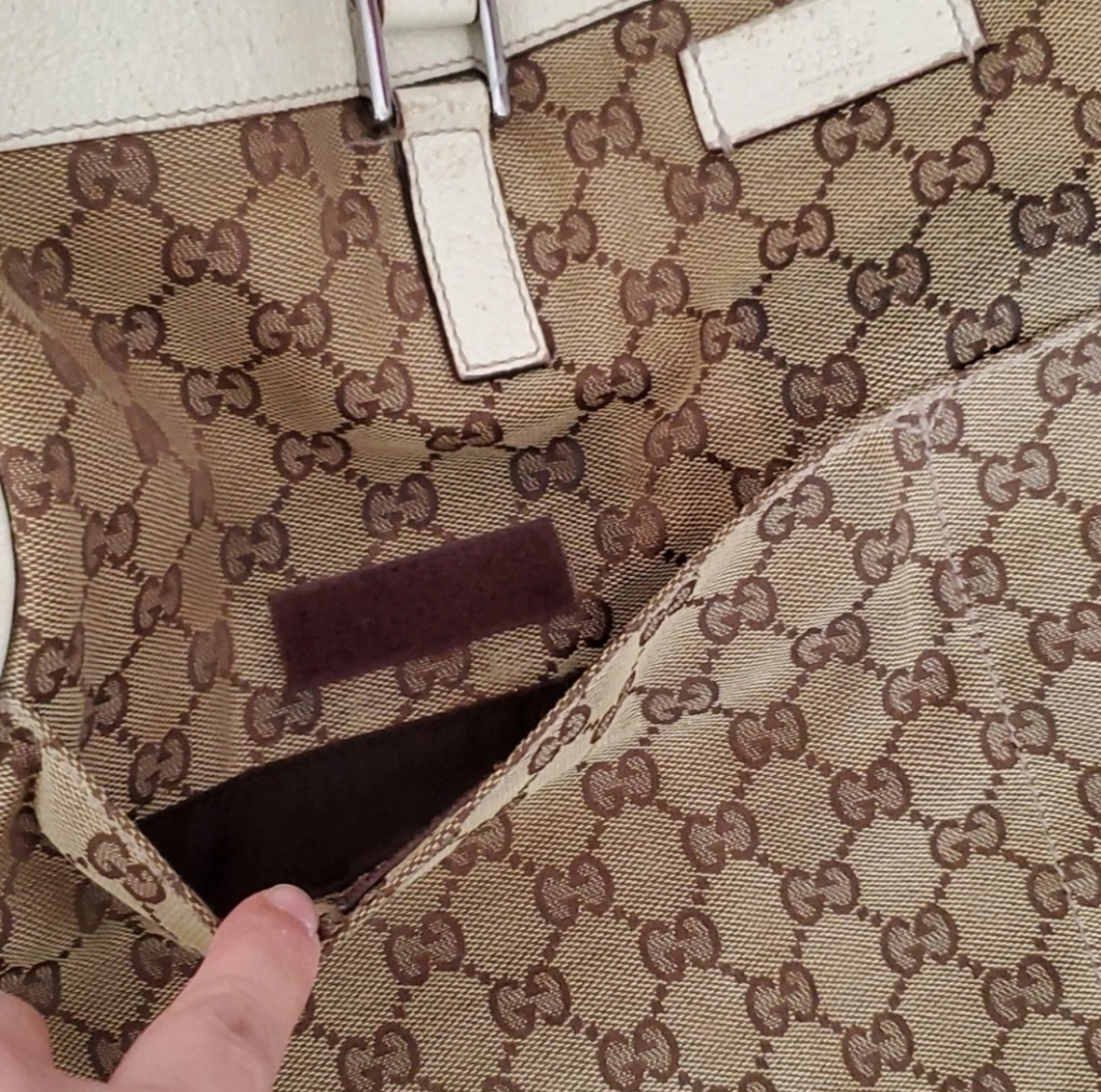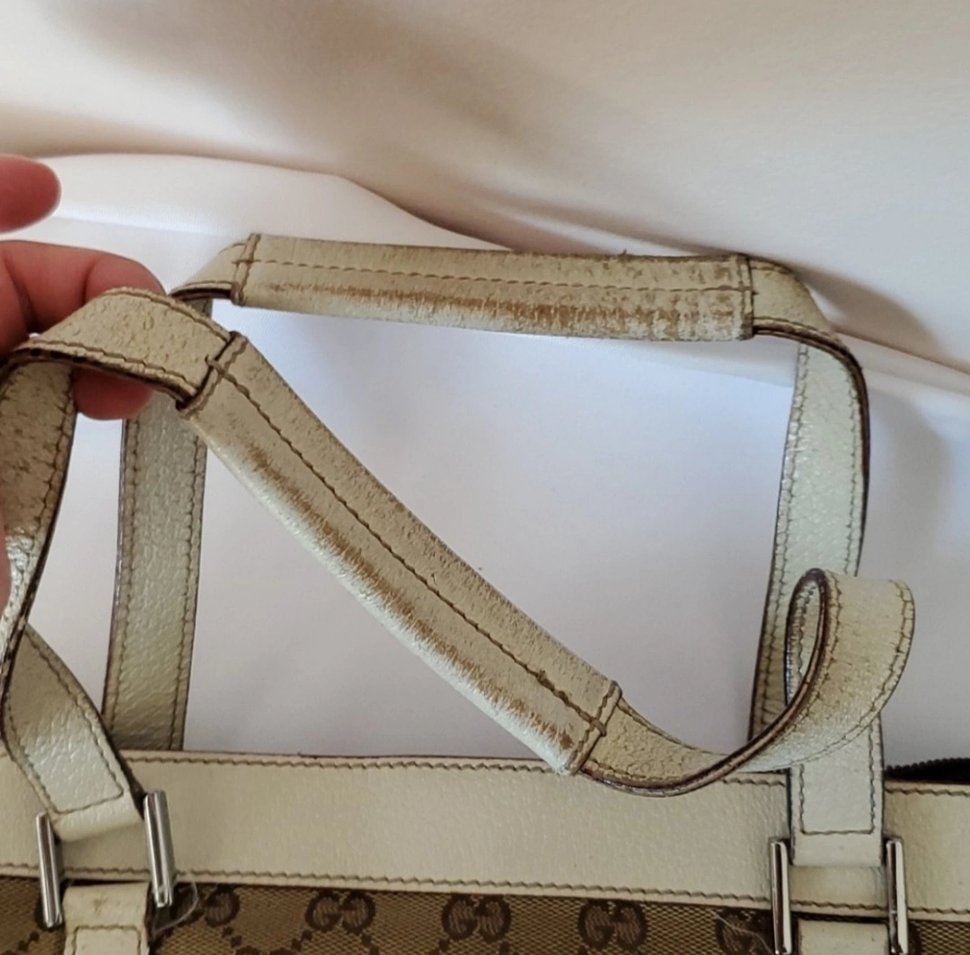 Large Gucci tote bag. Made in Italy. Brown GG canvas with white leather trim. Two top handles and a zipper closure.
